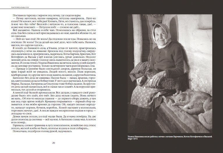 Книга составлена из рассказов очевидцев, писем, рисунков и фотографий. Автор, Геннадий Дурасов, сам знакомый с мастерицей, заботливо сохранил её рассказы, её живую речь. Ещё в книге много песен, прибауток, старинных слов, тишины, северной природы, любви и бабушкиных котов. И, конечно, нельзя не сказать о прекрасном полиграфическом качестве книги.