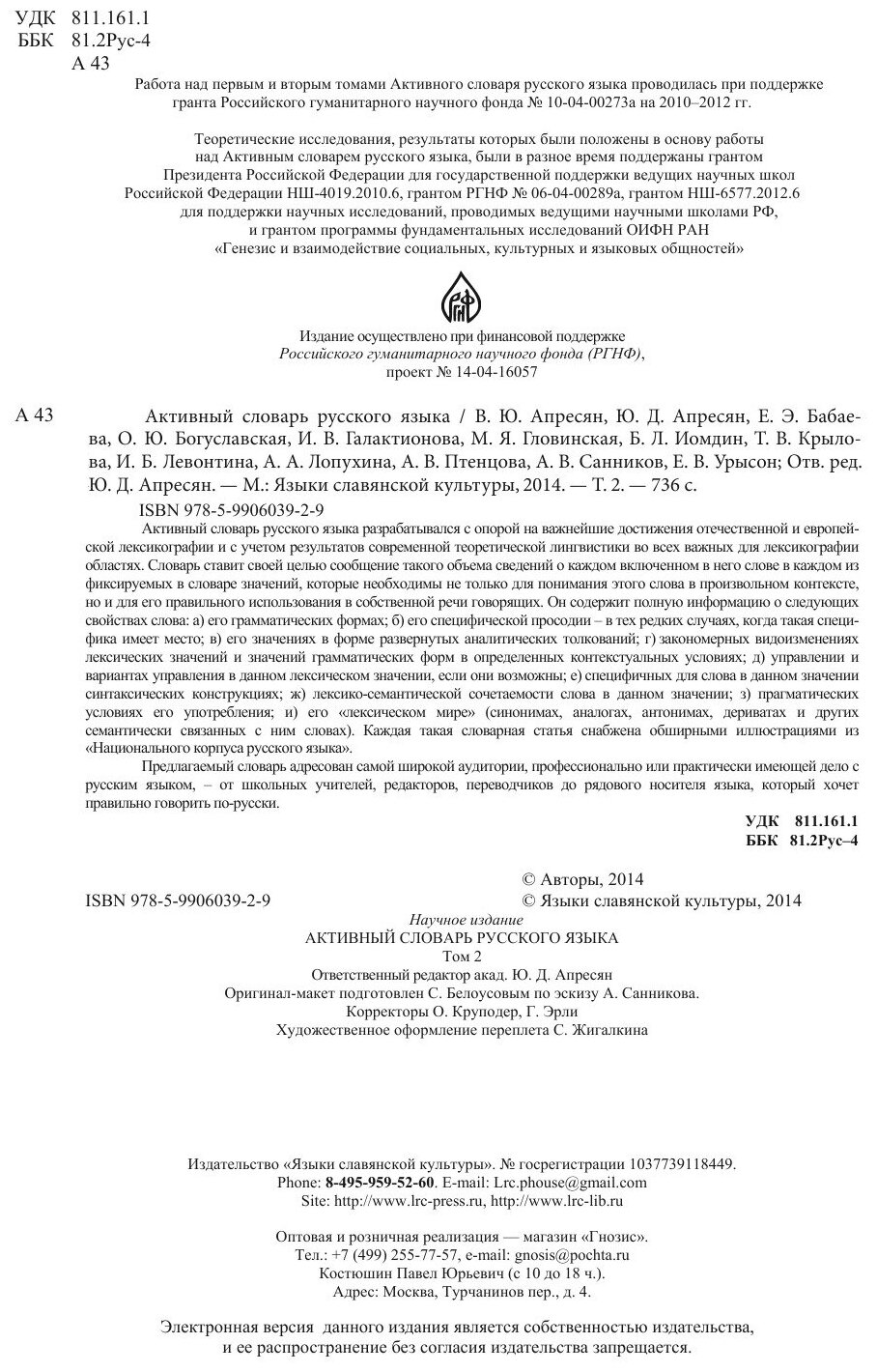 Активный словарь русского языка. Том 2. В-Г (Апресян Ю., Апресян В., Бабаева Е., Богуславская О. и др.); Языки славянских культур, 2014