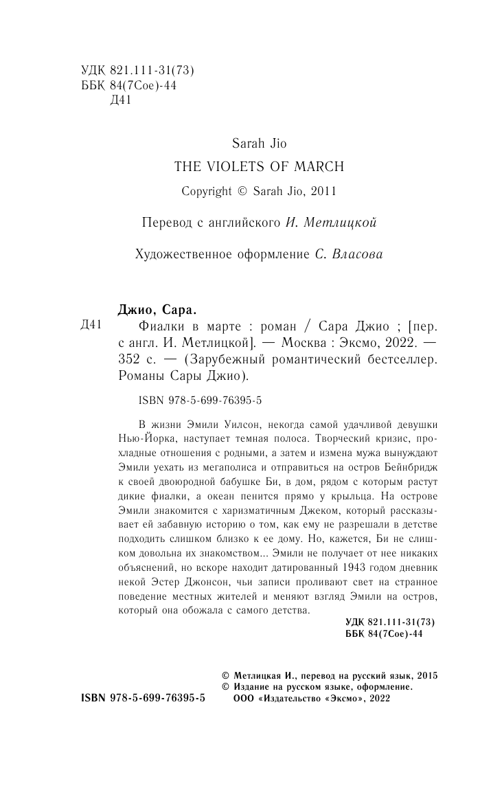 Книга: Фиалки в марте (Сара Джио); Эксмо, Редакция 1, 2022