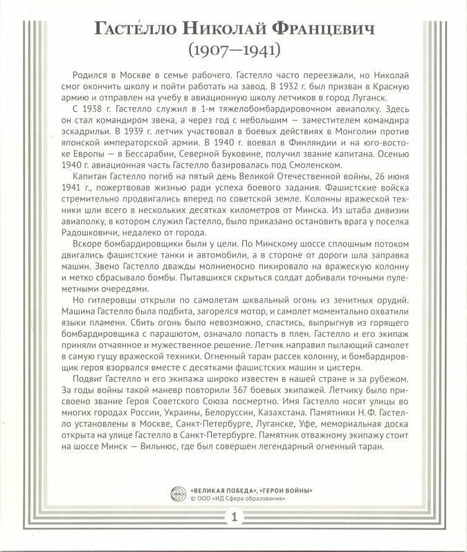 Комплект "Герои войны" посвящен 16 отважным и мужественным людям, совершившим подвиг ради своей страны и отдавшим все силы на борьбу с захватчиками в годы Великой Отечественной войны (1941-1945). В объеме комплекта представлены лишь некоторые, самые известные, Герои Советского Союза. Лаконичные тексты картинок содержат: краткую биографию героев; названия и описания мест сражений, военных операций, в которых они участвовали; выводы о значении подвига для победы нашей страны. Информация разбита на удобные для запоминания блоки. Знания даются сжато, но в достаточном для ребенка 6-11 лет объеме. Фотографии героев проиллюстрируют рассказ, сделают его образным и интересным. Картинки подходят для индивидуальной и групповой работы. Рекомендуем приобрести все тематически связанные комплекты серии "Великая Победа". В данном пособии невозможно дать информацию обо всех героях войны. Званием героя Советского Союза за время Великой Отечественной войны было награждено 11 657 человек. В каждом регионе, городе и районе есть свой герой. Рекомендуем, используя наше пособие о самых известных героях войны, вместе с детьми найти материал о герое вашего региона (города, деревни). В этом помогут ресурсы интернета (Википедия, сайт "Герои войны" и др.), материалы краеведческих музеев, библиотек и др. Эти материалы можно разместить в интернете, пополнив виртуальную "Книгу памяти".