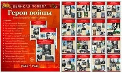 Комплект "Герои войны" посвящен 16 отважным и мужественным людям, совершившим подвиг ради своей страны и отдавшим все силы на борьбу с захватчиками в годы Великой Отечественной войны (1941-1945). На обороте каждого наглядного пособия кратко описана биография героя, названия и описания мест сражений, военных операций, в которых они участвовали, выводы о значении подвига для победы нашей страны. Картинки подходят для индивидуальной и групповой работы.