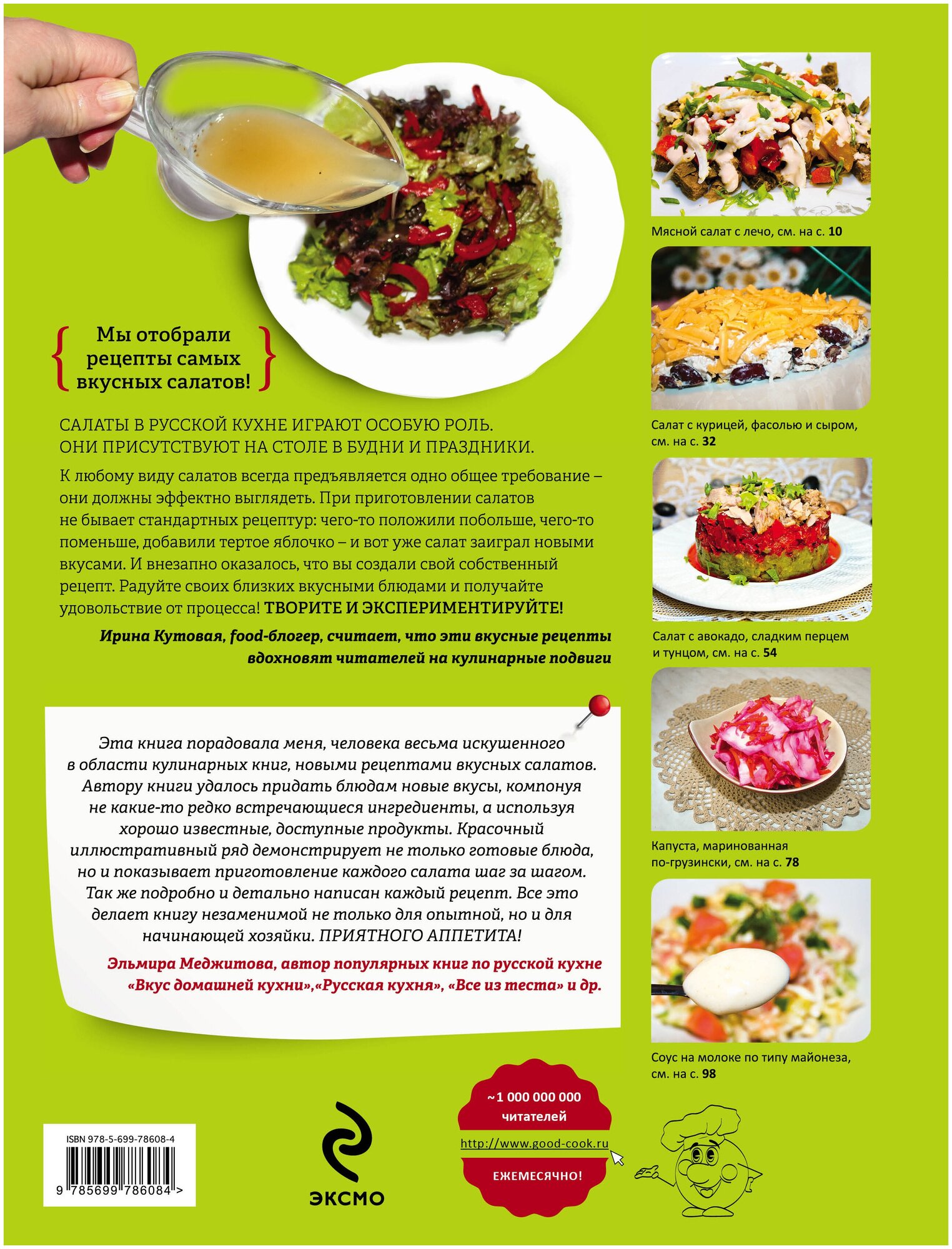 Книга очень понравилась, приятно, что рецепты сопровождаются фотографиями, представлены разнообразные рецепты современных салатов на любой вкус, порадовала отдельная глава о приготовлении соусов. Эта книга подходит для подарка, изложение, оформление, бумага- все на высоком уровне.