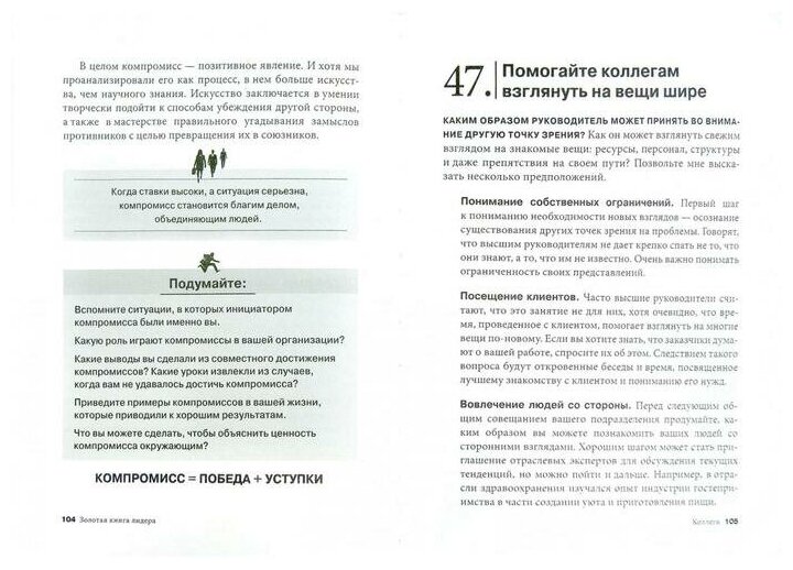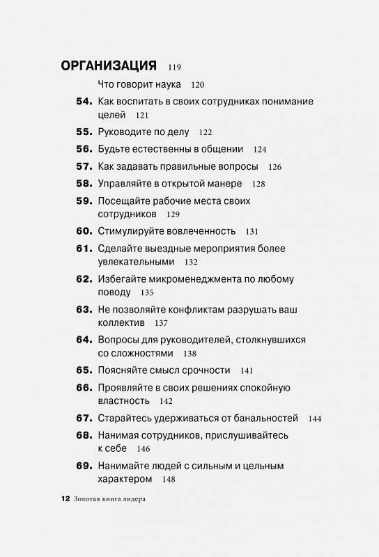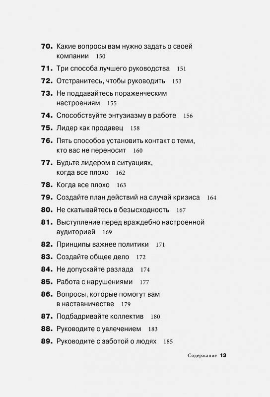 Эта книга - незаменимый помощник для руководителей любого возраста и опыта на все случаи жизни: как выступать перед враждебно настроенной аудиторией; как быть лидером, когда все плохо; как улучшать командный результат; как изящно продавливать свои решения; как заставить людей поверить в себя; как справиться с кризисом; как создать безупречную репутацию - всего 101 урок, содержащий способы и техники управления в любой ситуации. Все очень коротко, понятно и по делу. В каждом уроке даны небольшие упражнения для самоанализа и самооценки, а также выводы. Книга поделена на три части: личность, коллеги, организация. В конце каждой части - тест и советы.
