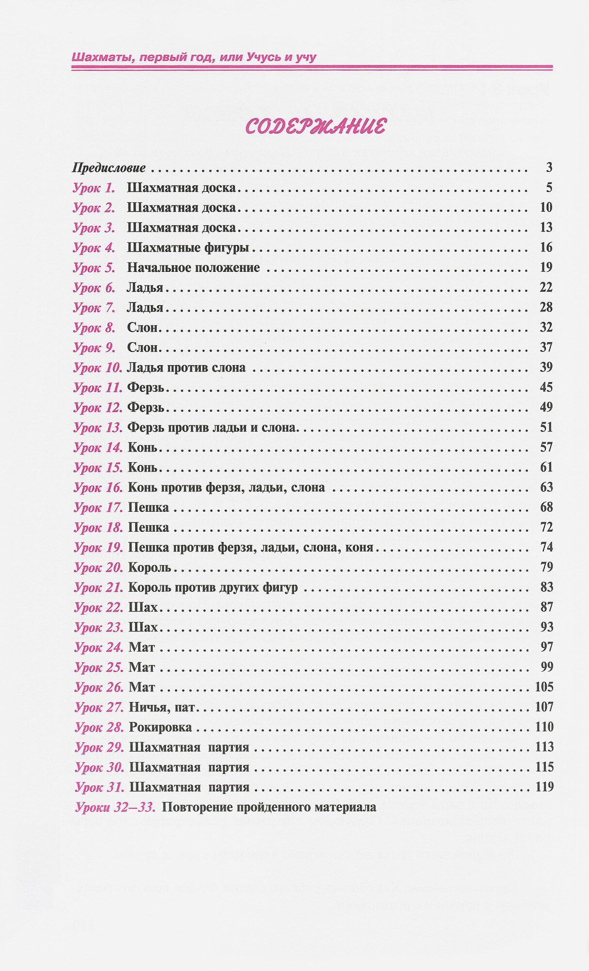 Отличное методическое пособие для педагогов, особенно если они не обладают большими знаниями в области шахмат. Программа первого года обучения предусматривает 33 шахматных занятия, в этом пособии дана подробная методика проведения каждого из них.