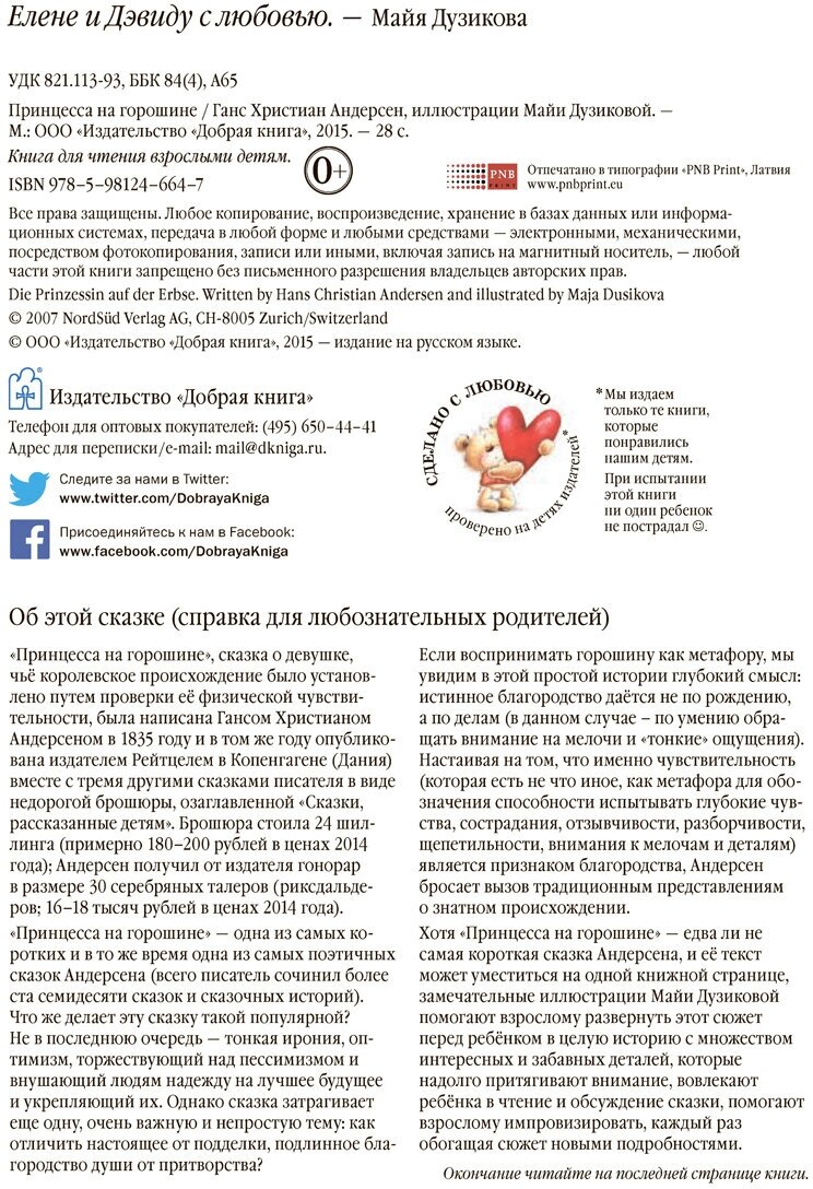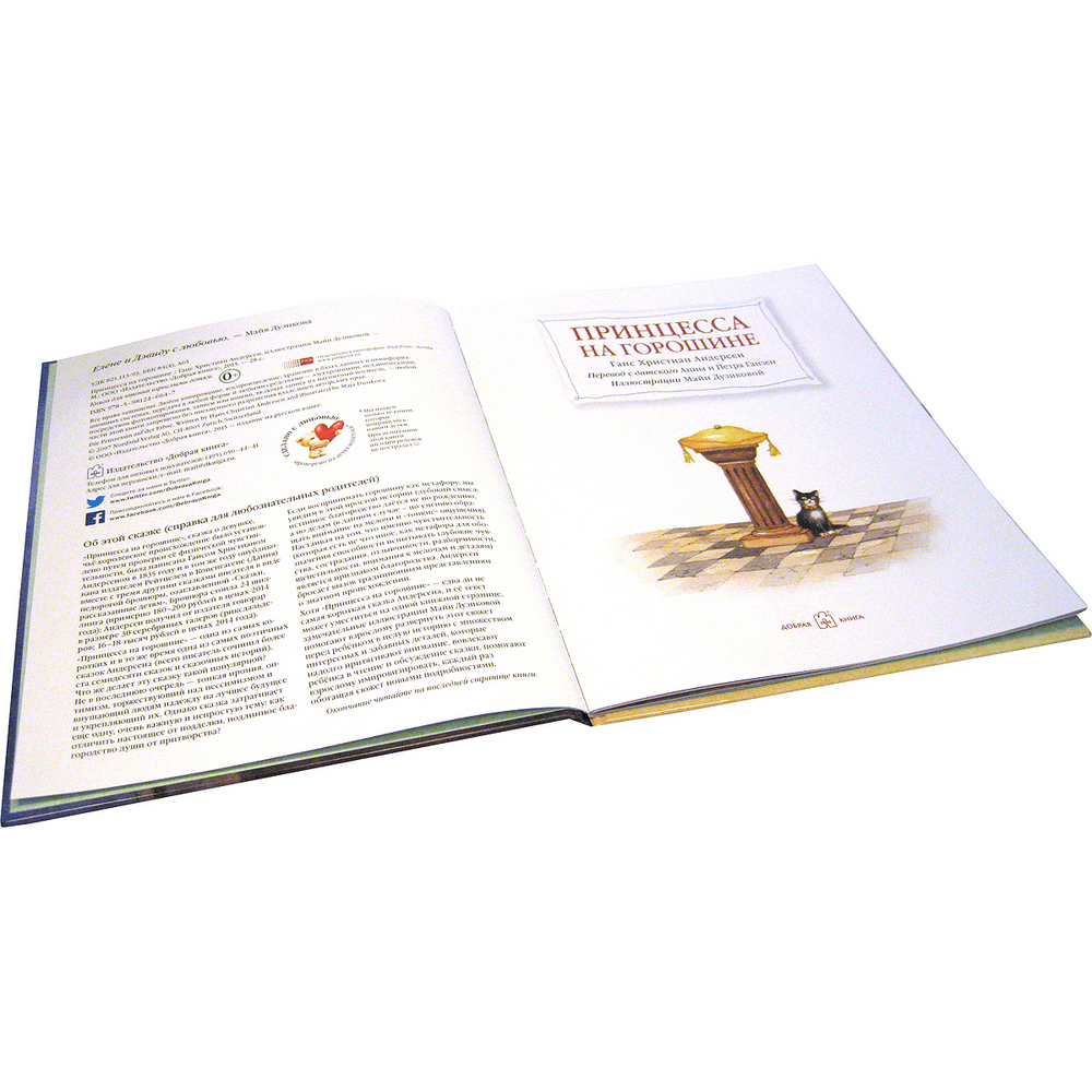 Без скидок однозначно дороговато. Поскольку сказка короткая, иллюстраций много - книгу будет интересно разглядывать ребенку. Предисловие (для взрослых) - на внутренней стороне обложки, ребенок на него внимания не обратит, несколько смутило началом: "сказка о девушке, чье королевское происхождение было установлено путем проверки ее физической чувствительности", но дальше лучше. Для истинных поклонников сказок, и Андерсена в частности, на подарок.