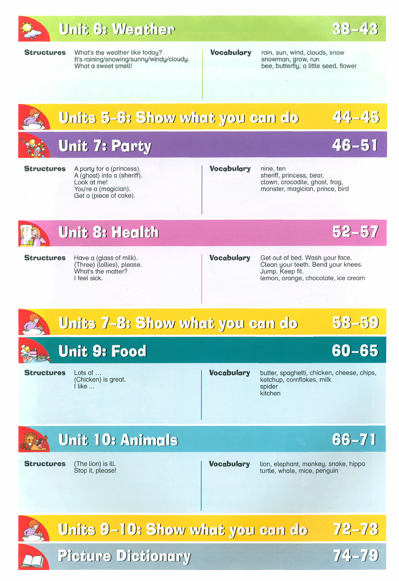 Книгу приобрела для дочери 5 лет, ей нравится, очень красочная. Что касается содержания, то оно охватывает следующие разделы: приветствие, школа, фрукты, домашние питомцы, игрушки, погода, здоровье, еда, животные. В каждом разделе от 10 до 15 новых слов. На протяжении всех уроков -счет. Пособие замечательное для самых маленьких учеников, не забывайте купить диск, т.к без диска смысла в покупке книги -нет.