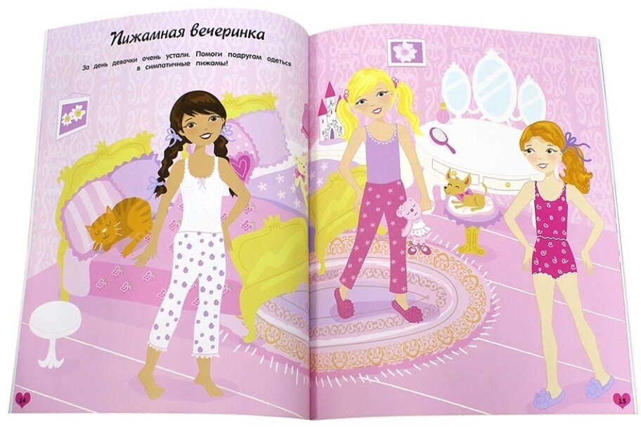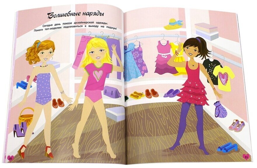 Если ваша дочь обажает устраивать показ мод и девочка-девочка от кончиков волос до кончиков ногтей! То скорее всего от книги она придет в восторг, но к сожалению хотя и книга содержит много наклеек но 5 летняя дочь моей подруги справилась за один раз..... не успокоилась пока всех не нарядила. Авторы лставляли подсказки кому и что надо наклеять-надеть.... но я даже я иногда терялась. Для фантазии пространства мало...