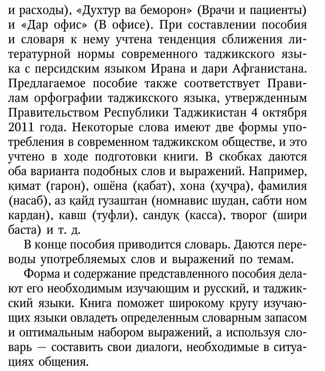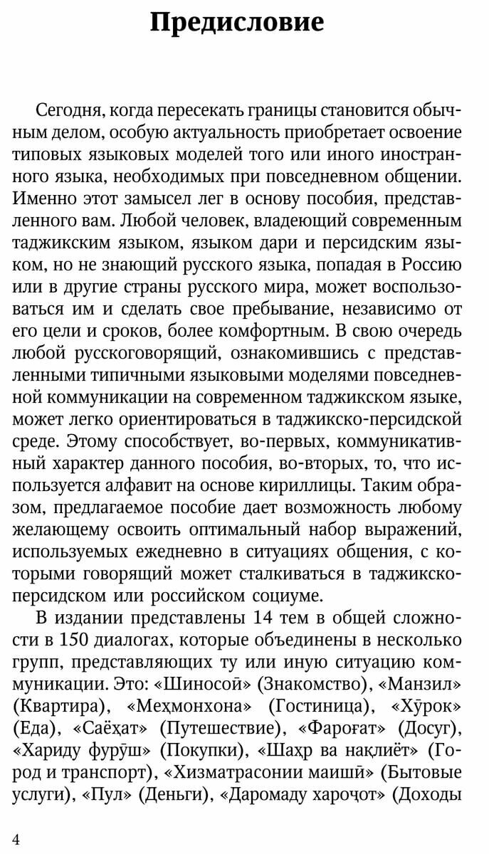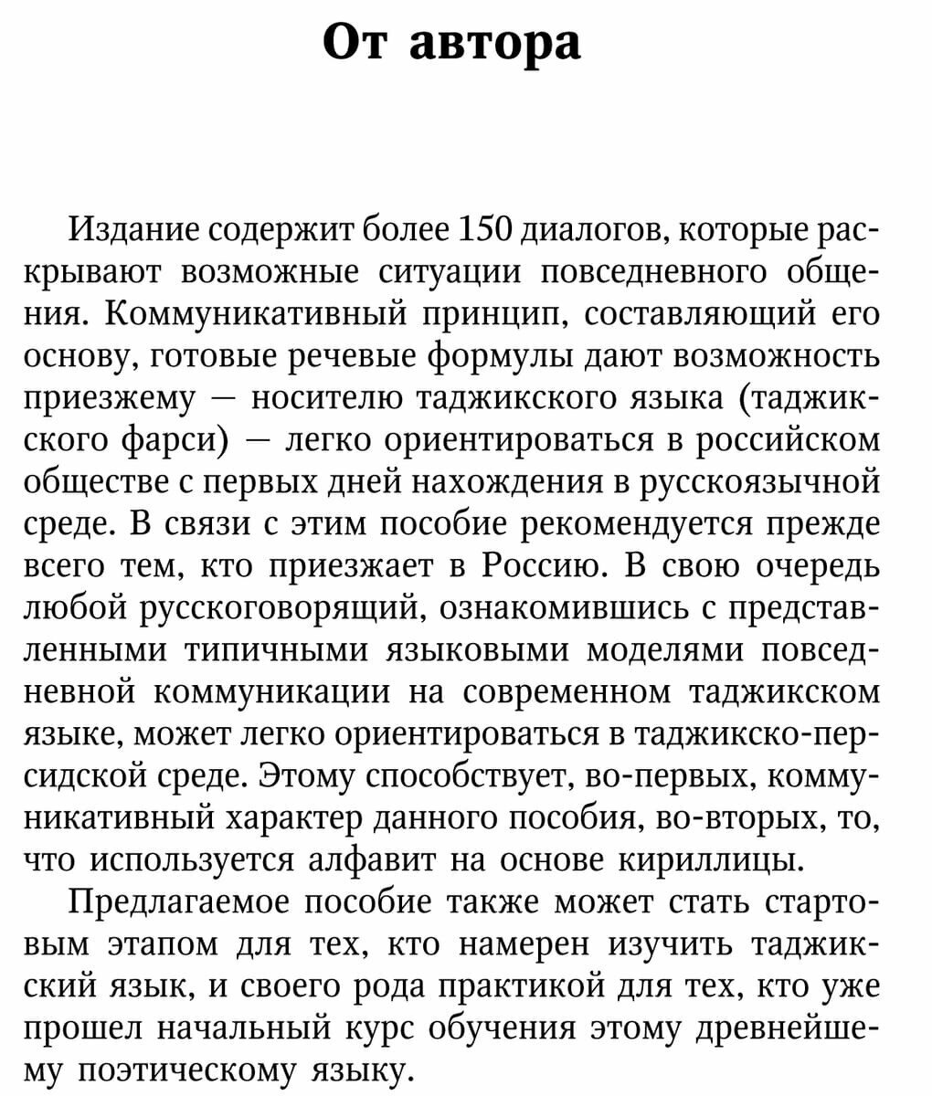 В связи с этим пособие рекомендуется прежде всего тем, кто приезжает в Россию. В свою очередь любой русскоговорящий, ознакомившись с представленными типичными языковыми моделями повседневной коммуникации на современном таджикском языке, может легко ориентироваться в таджикско-персидской среде.