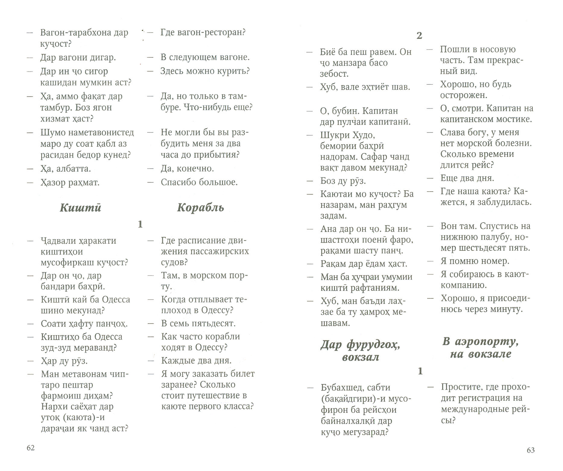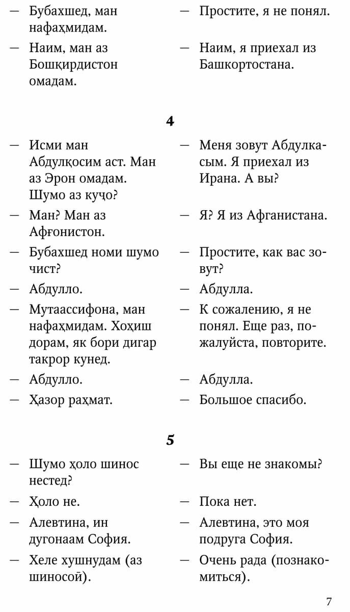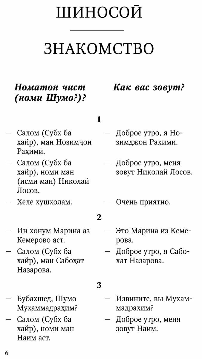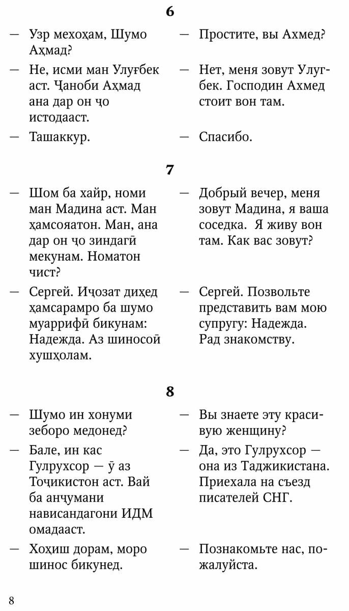 В связи с этим пособие рекомендуется прежде всего тем, кто приезжает в Россию. В свою очередь любой русскоговорящий, ознакомившись с представленными типичными языковыми моделями повседневной коммуникации на современном таджикском языке, может легко ориентироваться в таджикско-персидской среде.