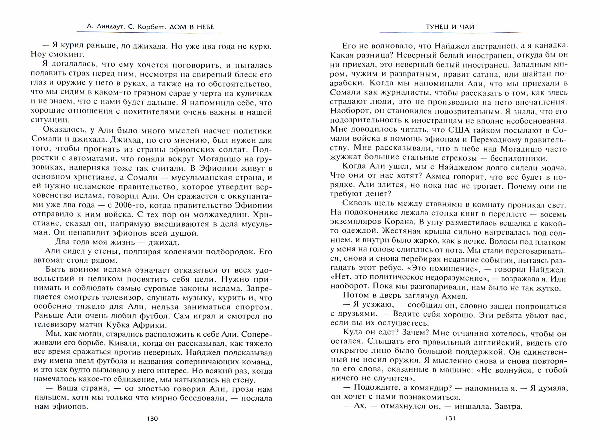В 2008 г. канадская журналистка Аманда Линдаут и австралийский фотограф Найджел Бреннан отправились в Сомали, чтобы готовить репортажи из этой "горячей точки" Африканского континента. По дороге в лагерь беженцев недалеко от Могадишо они были захвачены в плен вооруженным отрядом исламских фундаменталистов. После освобождения Аманда в соавторстве с Сарой Корбетт издала мемуары о выпавших на ее долю испытаниях. Это горький рассказ о 460 днях страданий и насилия, но также преодоления страха и боли. Книга получила широкую прессу и горячий читательский отклик по всему миру.
