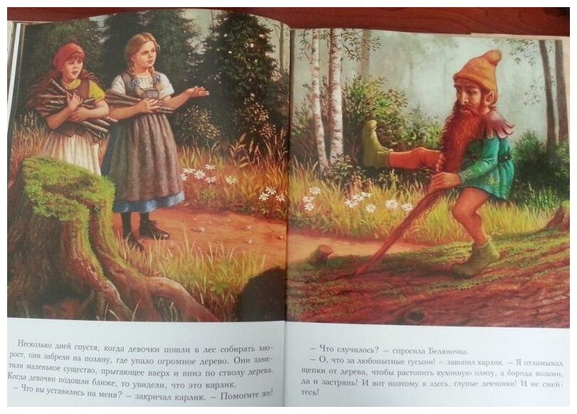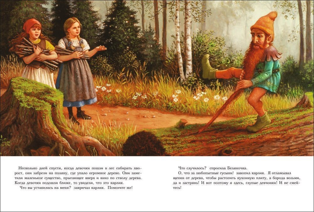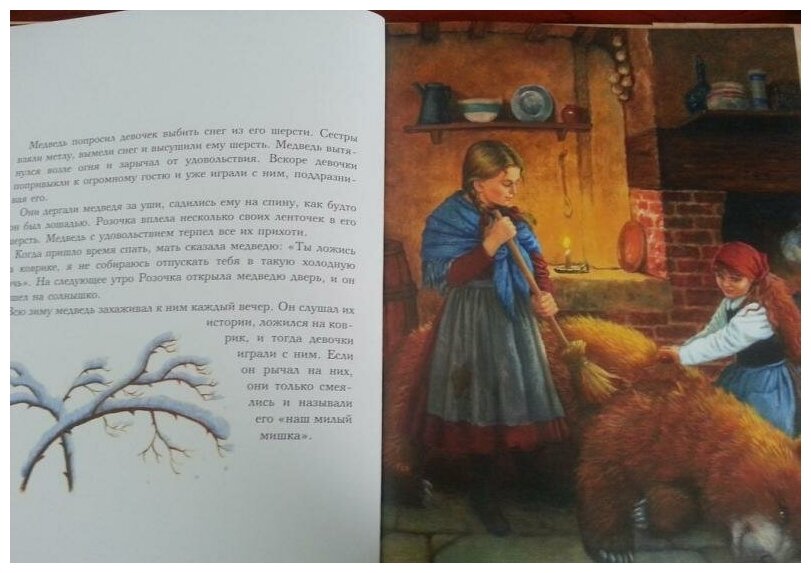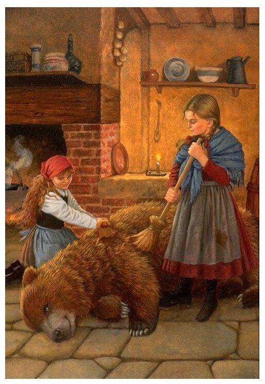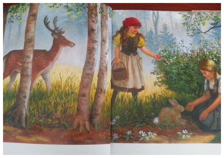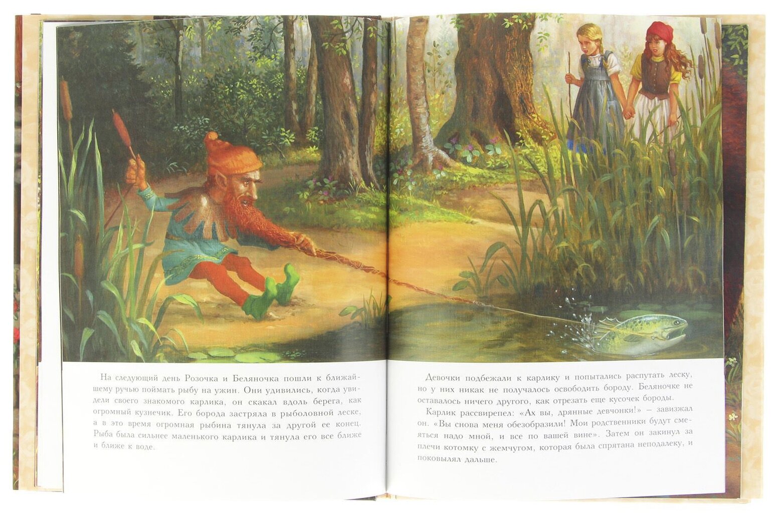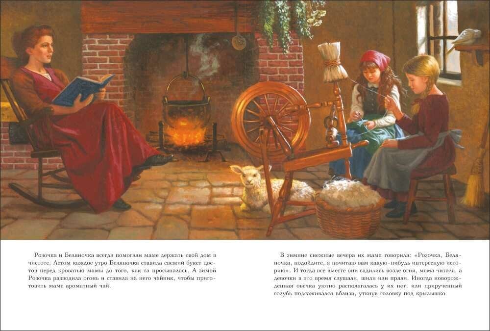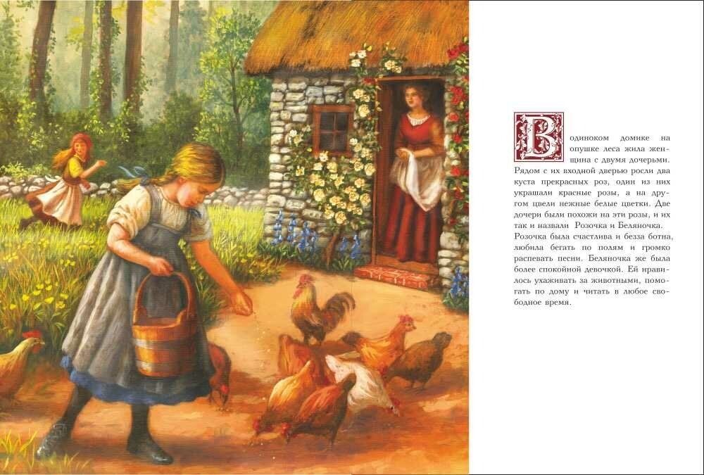 Сказка "Розочка и Беляночка", текст которой приведен из собрания произведений братьев Гримм, прекрасно иллюстрирована живописными и красочными картинами.