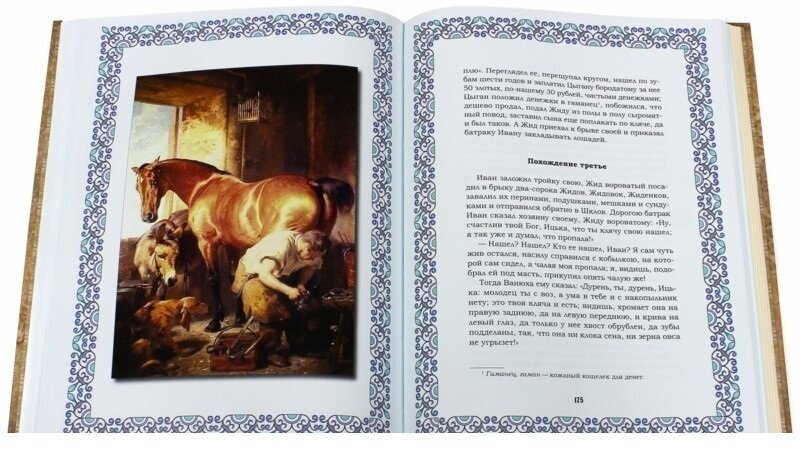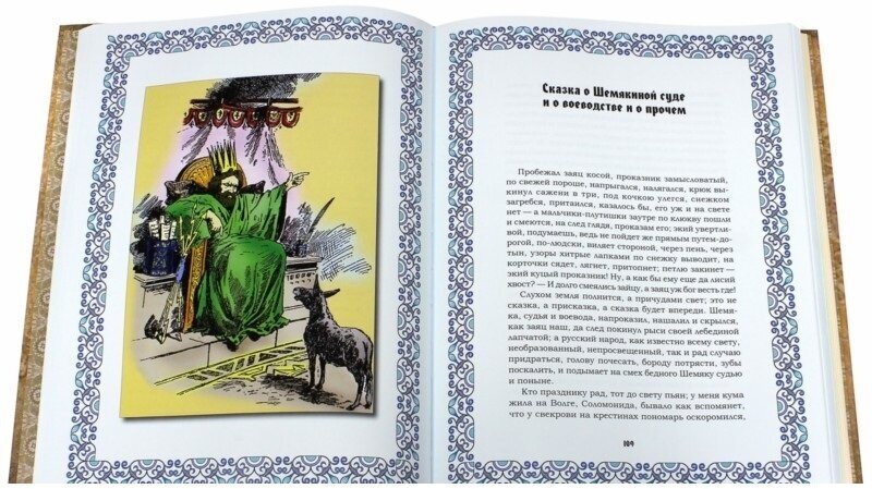 Здравствуйте! Покупала книгу для дочери пяти лет. У нее книга восторга не вызвала, потому как оформление книги для более старшего возраста. Вместо картинок используются репродукции картин, есть и иллюстрации, но, на мой взгляд, не для дошкольников. Книга визуально разделена на три части: для самых маленьких(картинок мало), о животных и народные сказки, для каждой свой цвет страниц. Страницы плотные, не бликуют, оформлены красочно, по периметру страницы красивый узор, шрифт средний.Переплет не плохой.
