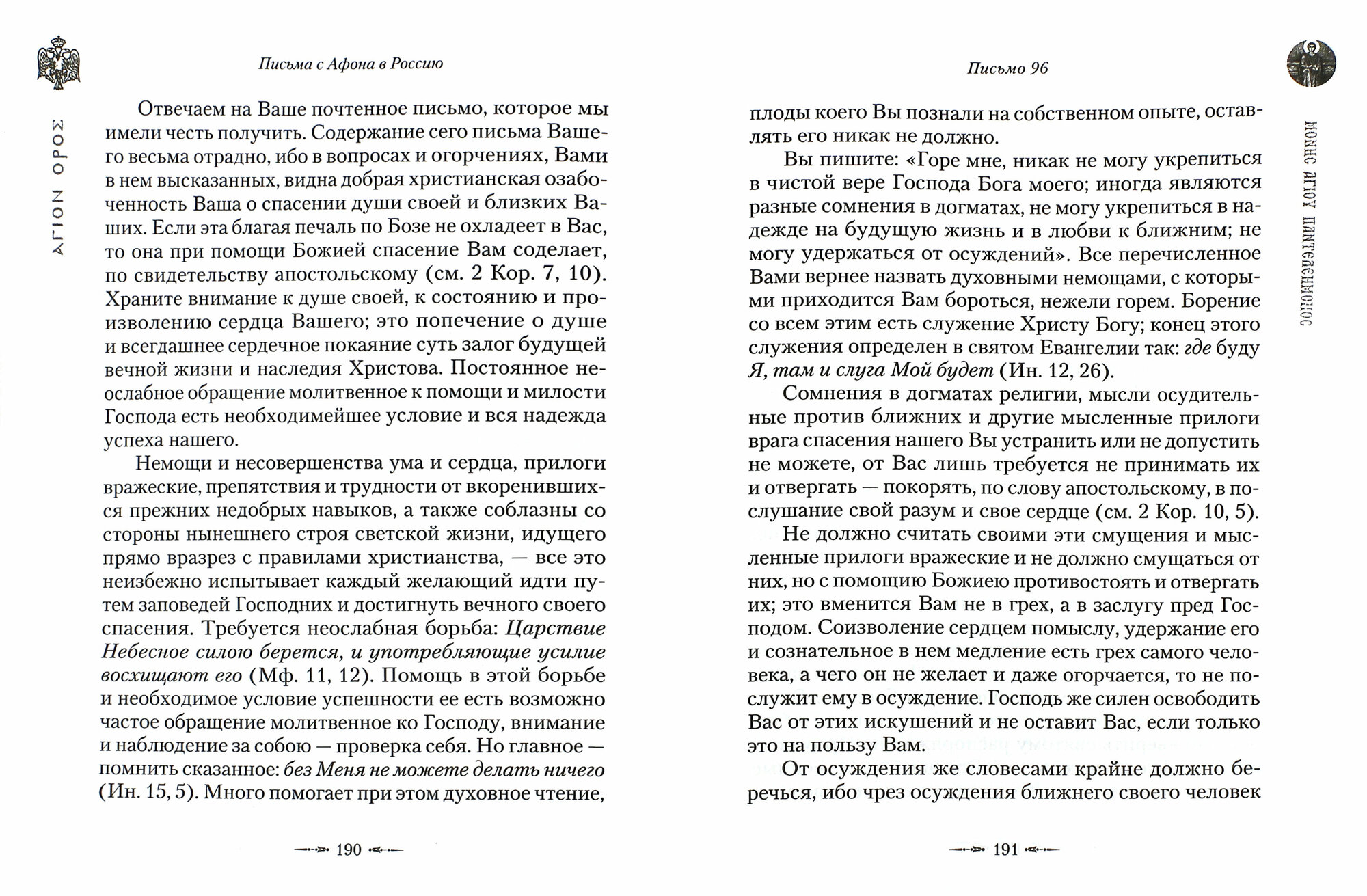 Книга "Письма с Афона в Россию" представляет собой публикацию афонских писем, собранных из частных архивных источников. Письма, написанные в разные времена (XIX - начало XX века) и к разным лицам, содержат душеполезные наставления и советы, назидают от Священного Писания и святоотеческого учения. Они - лишь малая частица той духовно-нравственной и молитвенной помощи боголюбивому русскому народу, которая поступала из Русского на Афоне Свято-Пантелеимонова монастыря в ответ на материальную поддержку, живое участие русских людей в нуждах святогорцев.