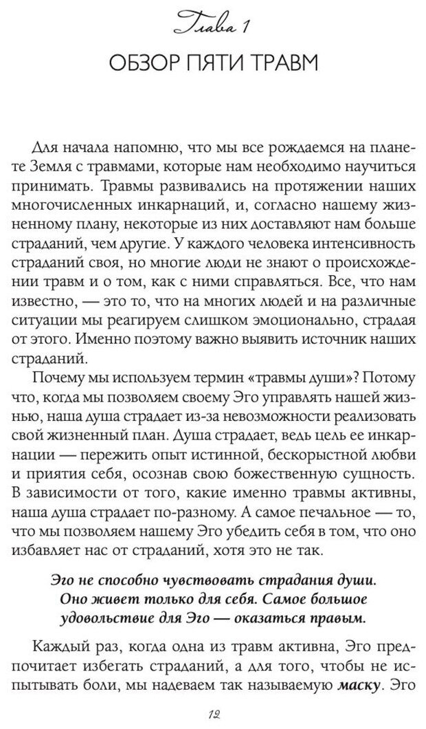 Даются простые и действенные методики диагностики и исцеления пяти травм. Обсуждается роль Эго в психической жизни человека и предлагаются ненасильственные стратегии работы с ним. Предварительного знакомства с другими книгами Лиз Бурбо не требуется. "Исцеление пяти травм" - самодостаточный и мощный инструмент для того, кто хочет стать хозяином своей жизни и достичь глубокой внутренней гармонии.