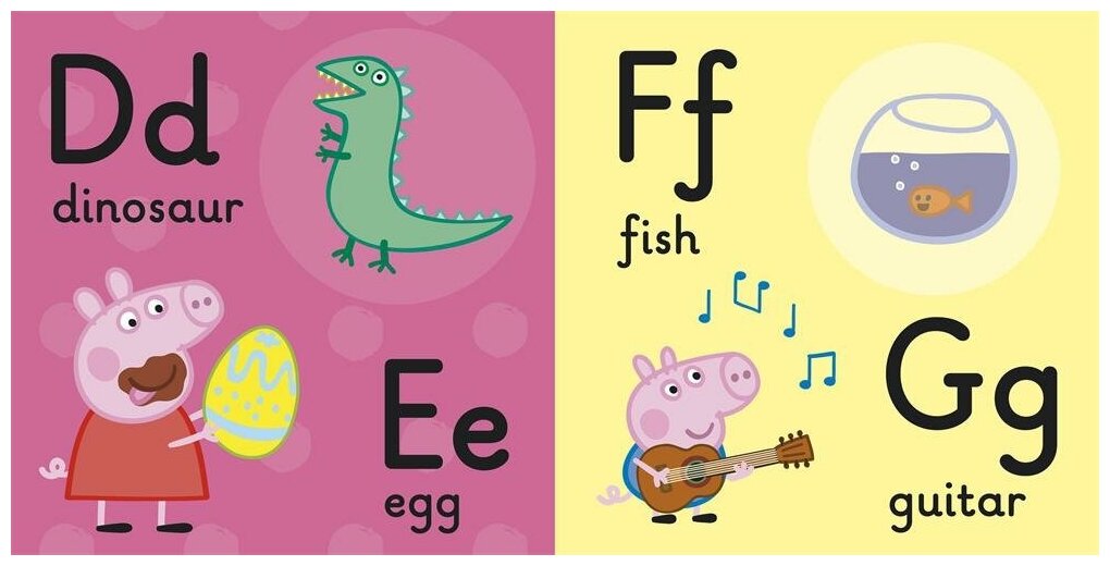 Покупкой очень довольна и я и ребенок (он просто обожает свинку Пеппу). Несмотря на цену (основной минус), понравилось качество печати. Книгу удобно держать в руке, она очень яркая, страницы плотные, так что можно их переворачивать до бесконечности. На последней странице напечатан весь английский алфавит.