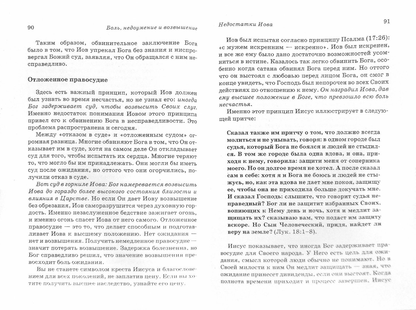 Основная тема книги Иова - показать, как Бог поднимает непорочного, честного, любящего Его всем сердцем человека на более высокий духовный уровень, о котором он даже не помышлял. Тот, кто терпит боль, подобную той, что испытывал Иов, проходит подготовку к более близким отношениям с Богом и будет восстановлен, чтобы стать частью церкви последних времен?- невесты Христа. Пусть пример Иова приблизит вас к самому высшему и лучшему в Боге!