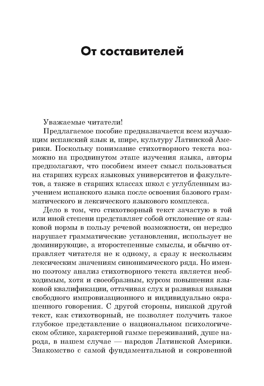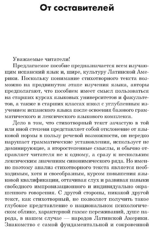 Предлагаемое пособие предназначено для изучающих испанский язык и, шире, культуру Латинской Америки. Понимание стихотворного текста возможно на достаточно продвинутом этапе изучения языка, поэтому книга рекомендуется к использованию на старших курсах языковых университетов и факультетов, а также в старших классах школ с углубленным изучением испанского языка после освоения базового грамматического и лексического языкового комплекса.