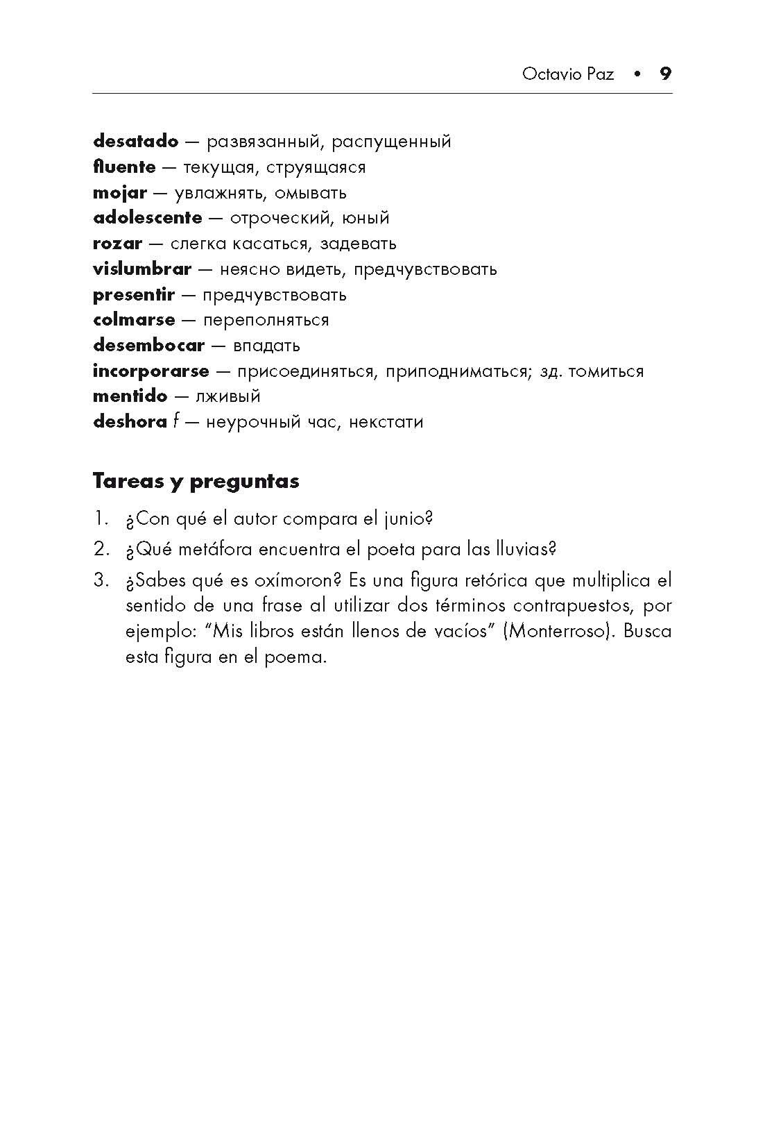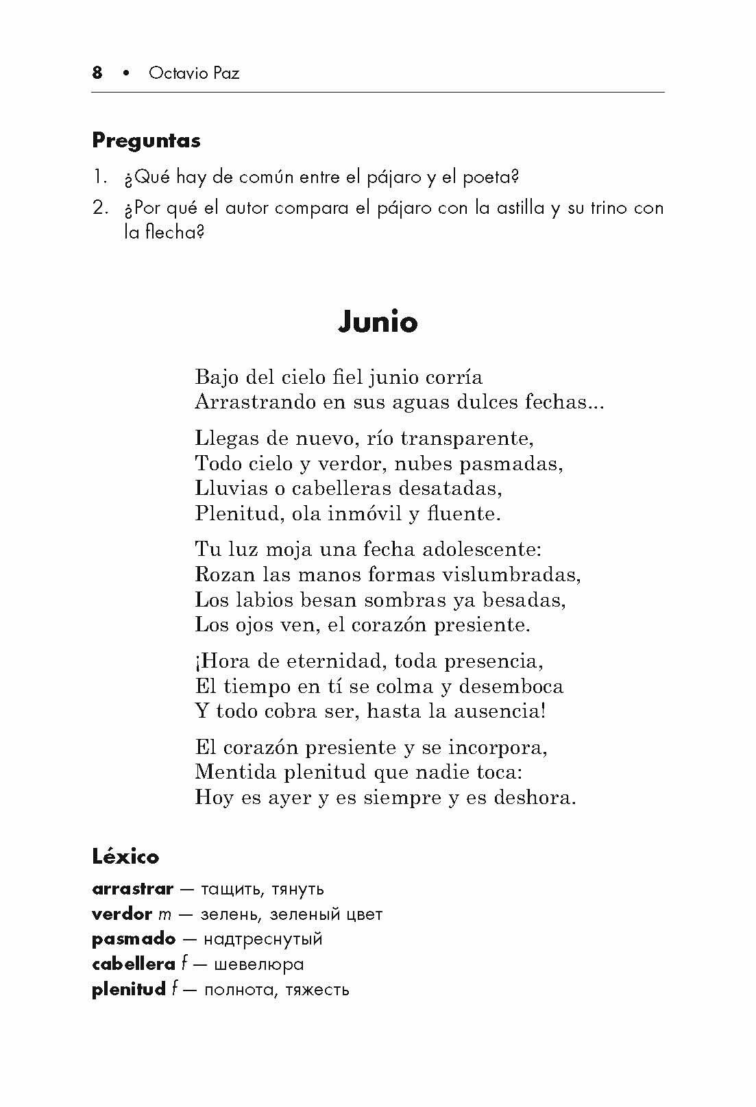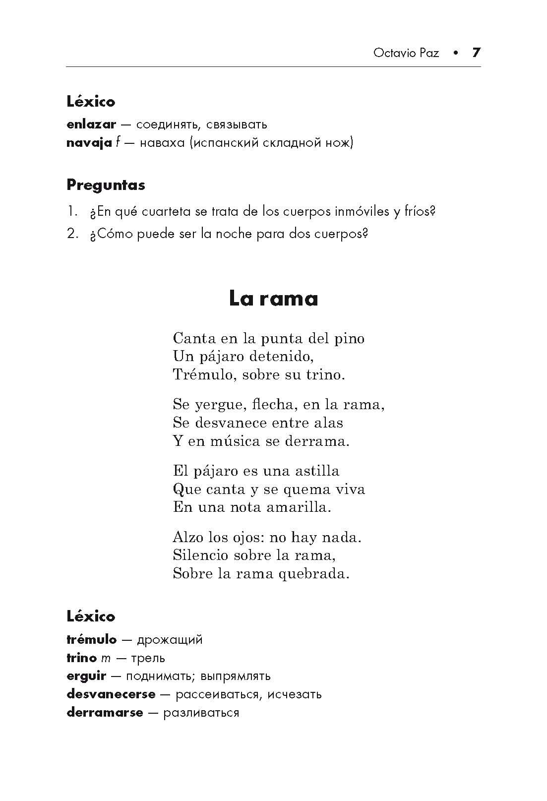Неплохой сборник латиноамериканских поэтов, можно использовать в качестве дидактических целей. Дается краткая биографическая справка, стихотворение, небольшой словарь и вопросы на понимание смысла. В конце книги, в приложении есть художественный перевод всех стихотворений и словарь.