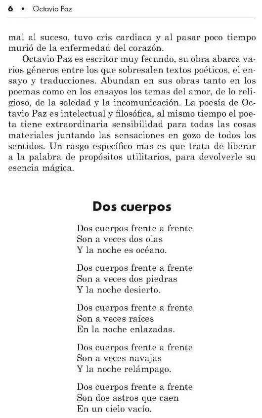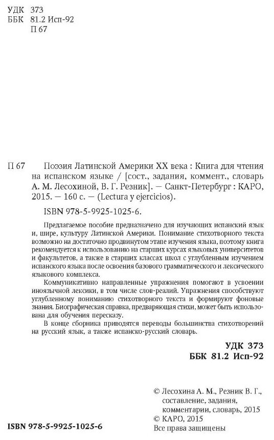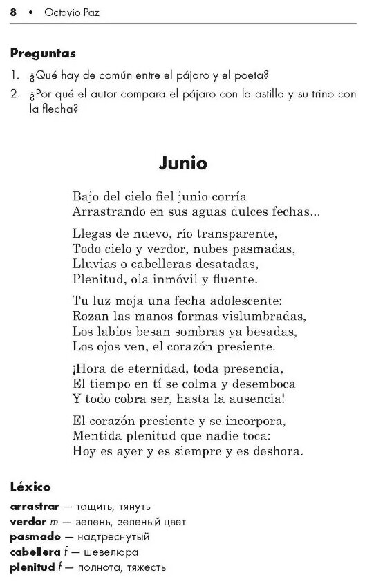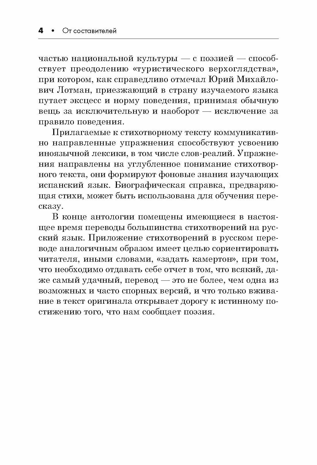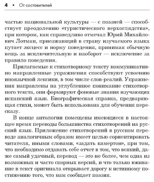 Неплохой сборник латиноамериканских поэтов, можно использовать в качестве дидактических целей. Дается краткая биографическая справка, стихотворение, небольшой словарь и вопросы на понимание смысла. В конце книги, в приложении есть художественный перевод всех стихотворений и словарь.