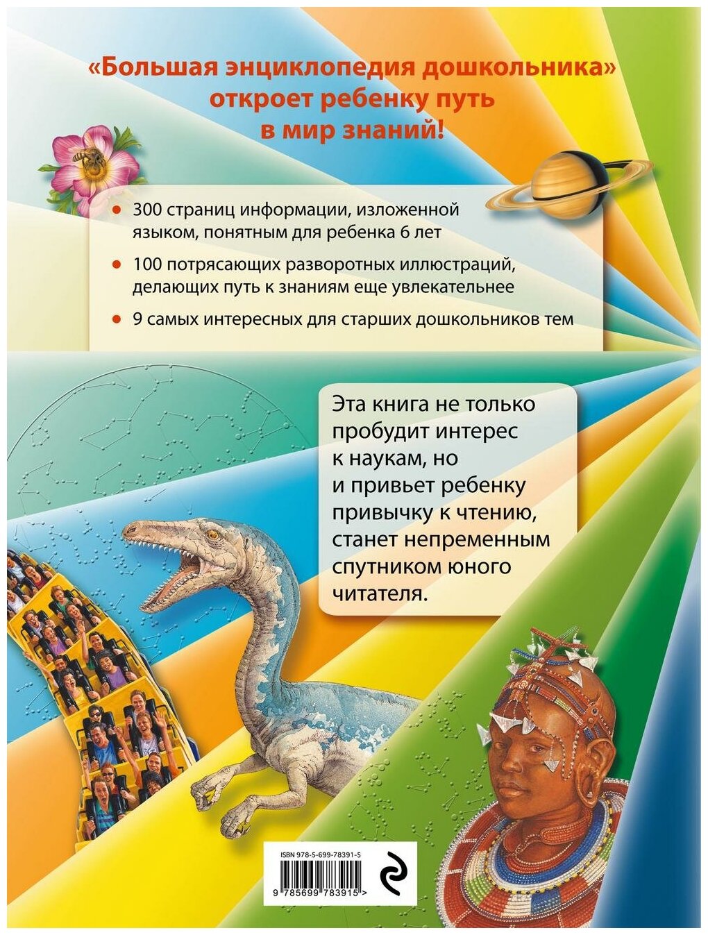 Все взрослые знают, как много вопросов задают дети. Порой дать ответы на казалось бы простые вопросы очень сложно. Справиться с ними поможет «Большая энциклопедия дошкольника». Книга содержит подробную информацию по самым интересным и необходимым для старших дошкольников темам: от динозавров и истории до техники и животного мира. Красочные познавательные иллюстрации на каждой странице, интересные, написанные простым языком тексты превращают процесс получения информации в удовольствие.«Большая энциклопедия дошкольника» — замечательный подарок для детей!АннотацияЭта книга дает подробную информацию по самым интересным и необходимым для старших дошкольников темам: от динозавров и истории до техники и животного мира. Тексты сопровождаются красочными и познавательными иллюстрациями. Энциклопедия не только пробудит интерес к наукам, но и привьет ребенку привычку к чтению, станет непременным спутником юного читателя.