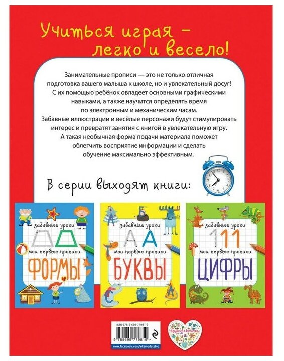 Книга предназначена для детей 5—7 лет. Играя с книгой, обсуждая, что нарисовано на картинках, обводя линии, дорисовывая и раскрашивая картинки, ребёнок быстро научиться определять время на механических и электронных часах, и подготовит руку к письму. Задания, содержащиеся в книге, расширят кругозор малыша и будут способствовать развитию мелкой моторики, творческих способностей, внимательности, фантазии, логического мышления.