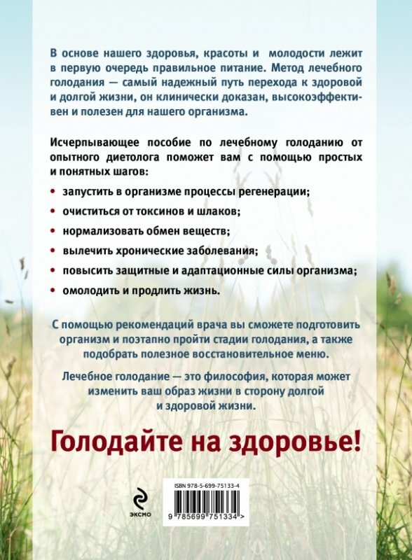 Книга написана врачом диетологом, является исчерпывающим пособием по лечебному голоданию, с помощью рекомендаций врача вы сможете подготовить организм и поэтапно пройти стадии голодания, а также подобрать полезное восстановительное меню.