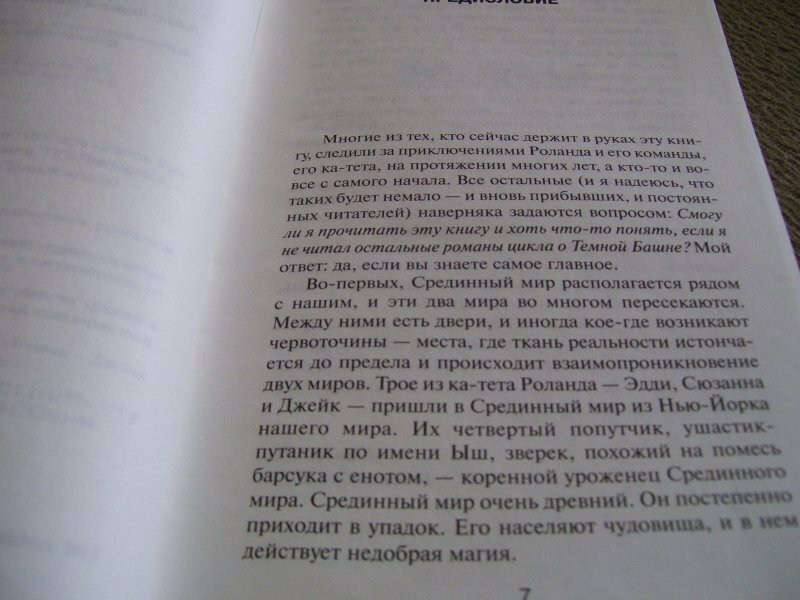 Если говорить о внутреннем содержании, то книга оставляет двоякое впечатление. Сюжет разворачивается в трёх плоскостях и каждую из них можно оценить по-разному. Как ни прискорбно, но та часть книги, где мы имеем дело со взрослым Роландом и его ка-тетом, является самой слабой. Не знаю, кого следует ругать за это, автора или переводчика, но текст буквально пестрит тавтологиями и кривыми лексическими оборотами, безжизненными блеклыми диалогами, да и написан словно на скорую руку. Немного лучше в этом плане другой слой - тот, где речь идёт о молодом Роланде. И уж совершенно иное впечатление производит собственно сказка, занимающая большую часть книги. Она безусловно хороша. Она выдержана именно в канве сказки со всеми сопутствующими особенностями, она обладает сильным, лихо закрученным сюжетом, она предельно насыщенна по сравнению с водянистостью других частей. Однако есть одно но - ранее Кинг обещал нам, что в восьмой книге серии будут ответы на некоторые вопросы, поставленные в предыдущих частях. Их нет и в помине. Главный минус этой книги в том, что ничего существенно нового и важного она не привносит. Её, точно так же, как и "Бессонницу", официально не входящую в цикл, можно спокойно пропустить и ничего от этого не потерять. С той лишь разницей, что "Бессонница" произведение куда более сложное и интересное. -