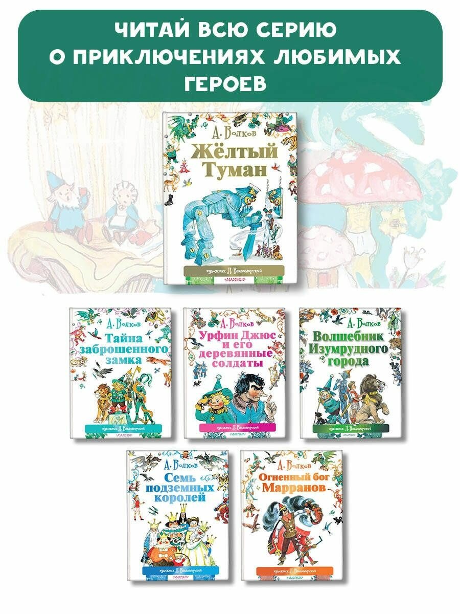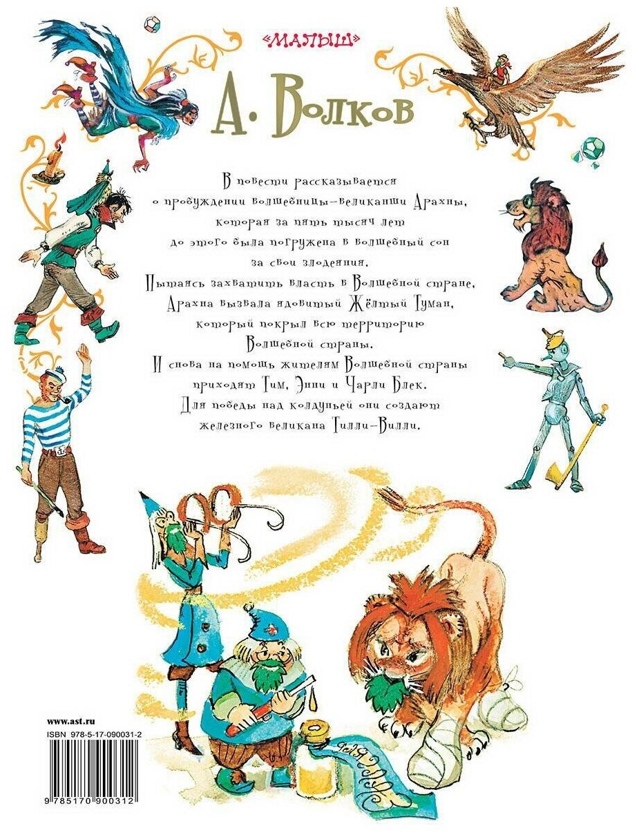 Сказочная повесть "Жёлтый туман" Волкова Александра Мелентьевича - это пятая из шести замечательных книг о "Волшебнике...." Оценка товара самая высшая: книга формата А4, белые, плотные листы, крупный шрифт (будет удобно читать вашим детям), обложка твёрдая. Проиллюстрировал книгу мой любимый художник Леонид Владимирский.