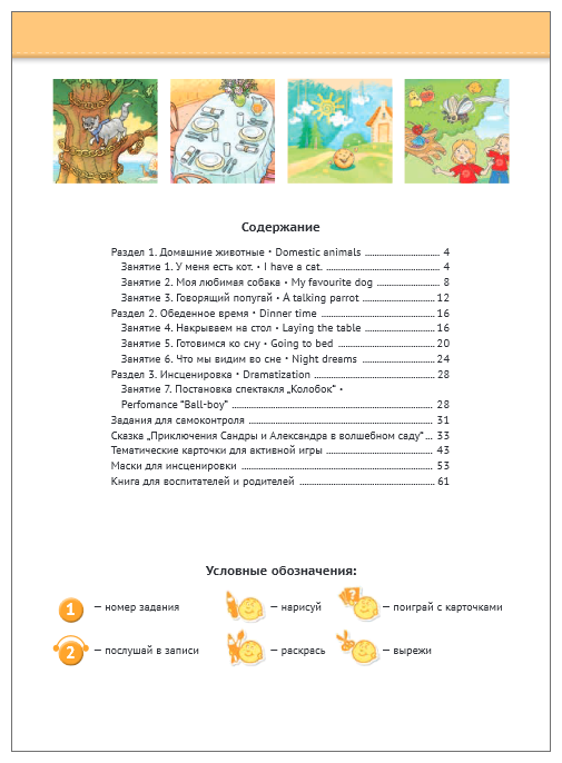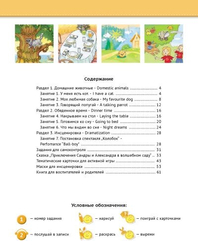 Настоящий хороший учебник английского для малышей. Состоит из 2-х частей, в первой - задания для детей, во второй - информация для взрослых, в которой к каждому занятию даются слова и фразы, которые ребенок должен запомнить. Картинки красивые. Ребенку книга понравилась. На диске можно послушать слова и стихи, которые представлены в учебнике, в русскоязычном сопровождении. Темы достаточно интересные, много материала для игр - тематические карточки, пазлы, маски животных.
