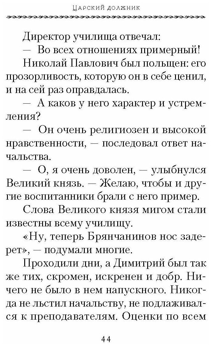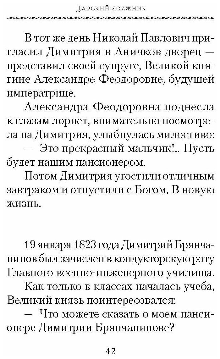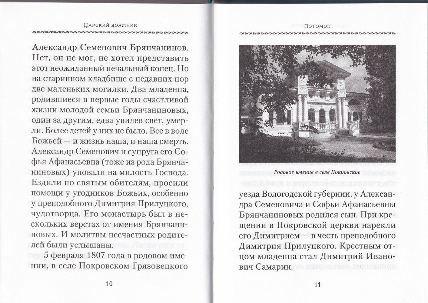Содержанию книги вполне соответствует и качество ее издания: красивая обложка, хороший переплет, белые страницы, крупный шрифт, наличие иллюстраций. Книга входит в серию «Библиотека православного отрока» издательства «Сибирская Благозвонница», но будет, безусловно, интересна не только юному, но и взрослому читателю. Несмотря на то что в свое время мне удалось познакомиться с жизнеописанием святителя Игнатия в нескольких источниках, книга Е. Ереминой «Царский должник» наиболее запомнилась из всего прочитанного на эту тему.