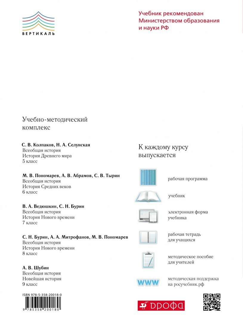 Рабочая тетрадь входит в состав УМК по всеобщей истории С. Н. Бурина, А. А. Митрофанова, М. В. Пономарева и соответствует ФГОС основного общего образования. Тетрадь также может использоваться с учебником, соответствующим Федеральному компоненту государственного образовательного стандарта. Помимо тетради в состав УМК входят электронное приложение к учебнику и методическое пособие. Специальными значками отмечены задания, направленные на формирование метапредметных умений (планировать деятельность, выделять различные признаки, сравнивать, классифицировать, устанавливать причинно-следственные связи, преобразовывать информацию и др.) и личностных качеств учеников. Рекомендовано Министерством образования и науки РФ. 3-е издание, стереотипное.