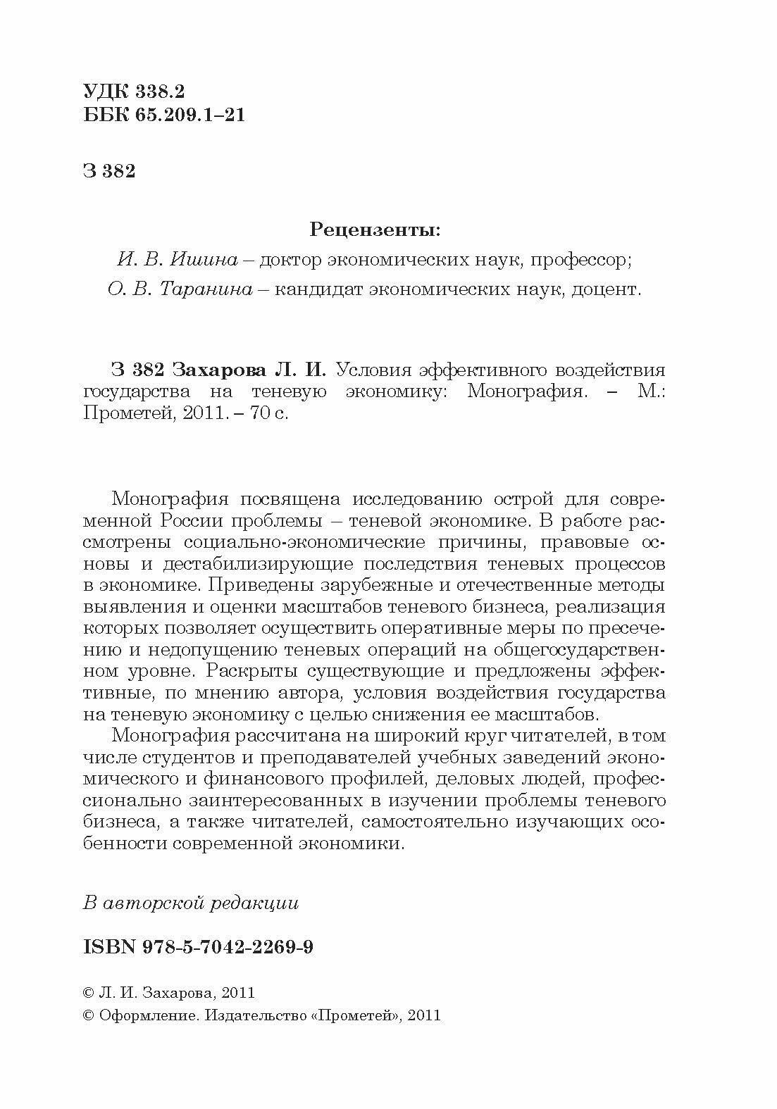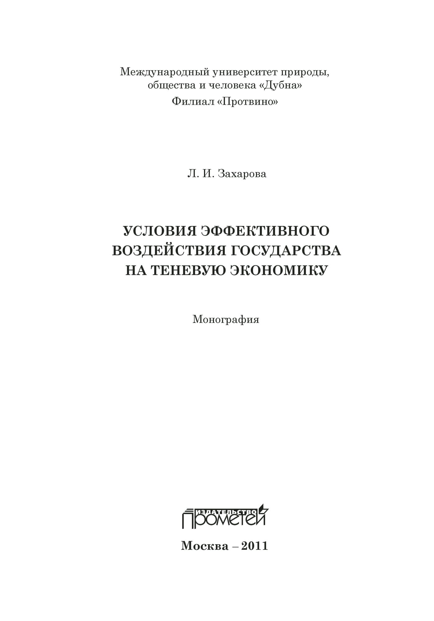 Условия эффективного воздействия государства на теневую экономику. Монография (Захарова Лариса Ивановна); Прометей, 2011
