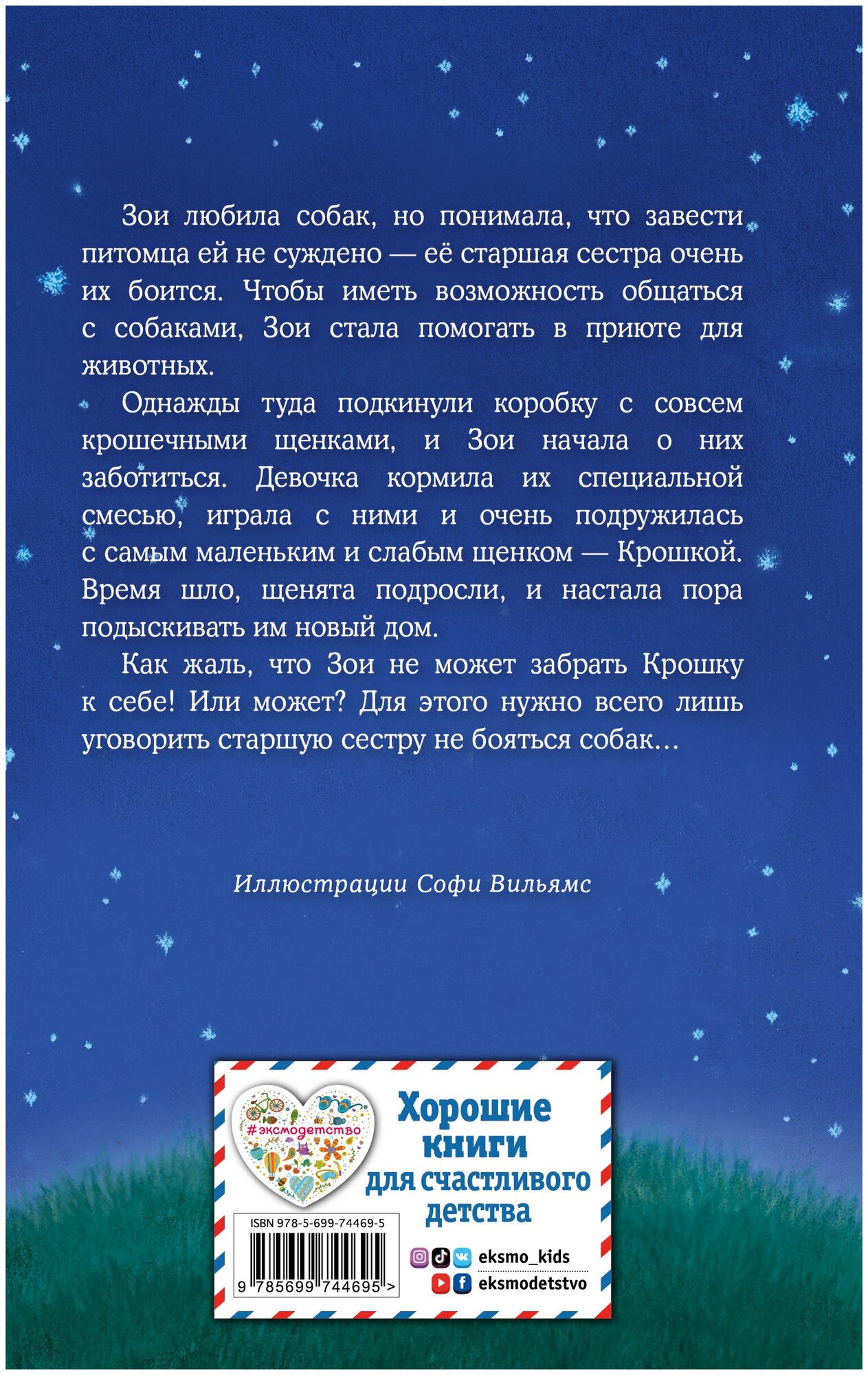 Зои любила собак, но понимала, что завести питомца ей не суждено – ее старшая сестра очень их боится. Чтобы иметь возможность общаться с собаками, Зои стала помогать в приюте для животных. Однажды туда подкинули коробку с совсем крошечными щенками и Зои начала о них заботиться. Девочка кормила их специальной смесью, играла с ними и очень подружилась с самым маленьким и слабым щенком – Крошкой. Время шло, щенята подросли, и настала пора подыскивать им новый дом. Как жаль, что Зои не может забрать Крошку к себе! Или может? Для этого нужно всего лишь уговорить старшую сестру не бояться собак…