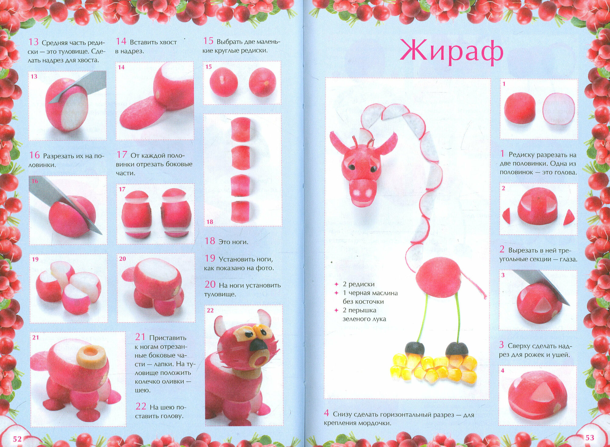 Очаровательный бегемот и мудрая сова, забавный заяц и смешной ежик, беззаботная стрекоза и трудяга муравей, добрый гном и белочка-затейница - ваши родные и друзья будут в восторге! А дети с удовольствием примут участие в изготовлении эффектных цветов и милых фигурок - их выполнение не требует особых навыков. Оригинально украшенные блюда превратят даже самый обычный завтрак в настоящий праздник! Подробные инструкции и красочные фотографии помогут в работе.