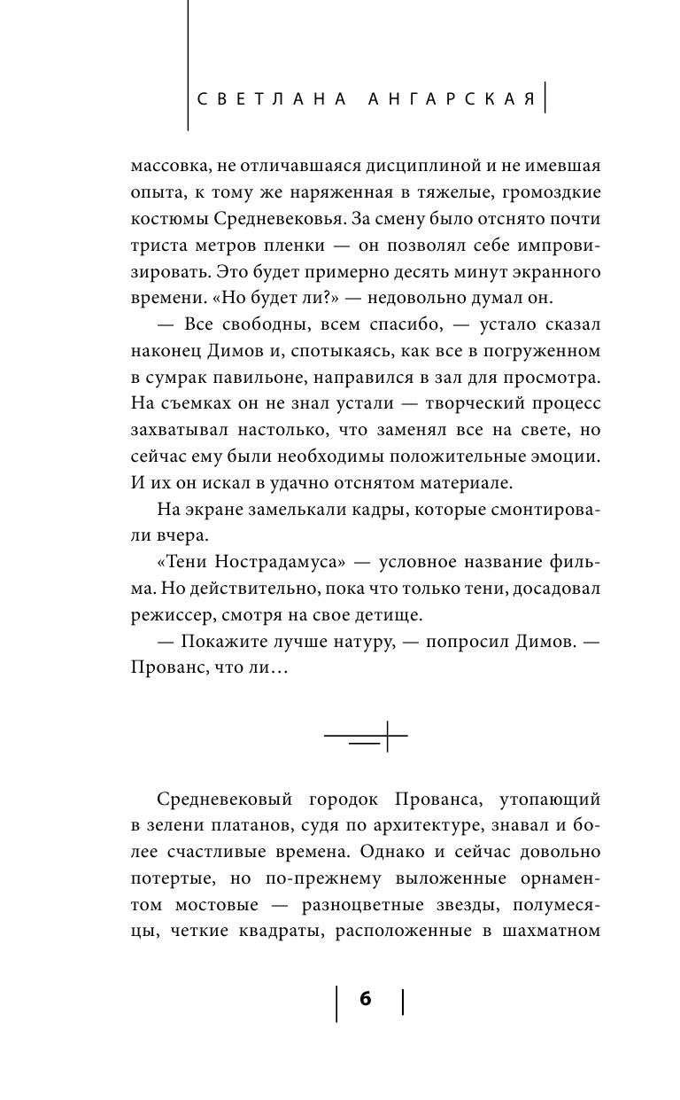 Общество нуждается в просветлении: Как снять кино и написать книгу? Рецензия на роман Светланы Ангарской «Просветленные» (Москва, «Эксмо», 2015. - 352 с.) С самого начала стоит отметить: в романе сочный язык, способный увлечь с любого места. И даже оформление книги выполнено с тщанием человека, пекущегося о создании как можно более глубокого впечатления от своего творения. В новом российском романе возрождена, казалось бы, устаревшая с 90-х годов тема потустороннего (оккультизма, предсказаний и т. п.). Непознанные явления (предсказания Нострадамуса и не только) раскрыты с точки зрения человека, стремящегося к популяризации загадок истории и ясновидения. Важна даже постановка подобных вопросов – и это много для современного равнодушного общества, с атрофировавшейся любознательностью к науке, культуре и поиску неведомого (мы стали слишком взрослыми – в наше время даже не каждый подросток имеет пытливый ум). В книге противостояние героя-борца с окружающим миром выражено в том, что режиссер снимает фильм о Нострадамусе: это нелегкое занятие, хронически не хватает средств на финансирование кинокартины... Соединение нескольких сильных моментов: стиля изложения, темы потустороннего и, наконец, противостояния человека против общества во имя блага – и всё это в книге публициста, писателя и сценариста Светланы Ангарской. Само название – «Просветлённые» подчёркивает благость устремлений героя книги, пытающегося заставить людей задуматься о загадках прошлого и будущего (в книге раскрываются и непростые реалии дня сегодняшнего). Итак, задача главного героя благородна: приоткрыть завесу тайны человеческой психики, рассказать языком кино о нелегком пути человека, поставившего свое задачей рассказать людям информацию о будущем, которую он (пусть и подчас и с искажениями) Мишель Нострадамус донес до нас в своих стихотворных катренах. Алексей ГЕРГЕНОВ.