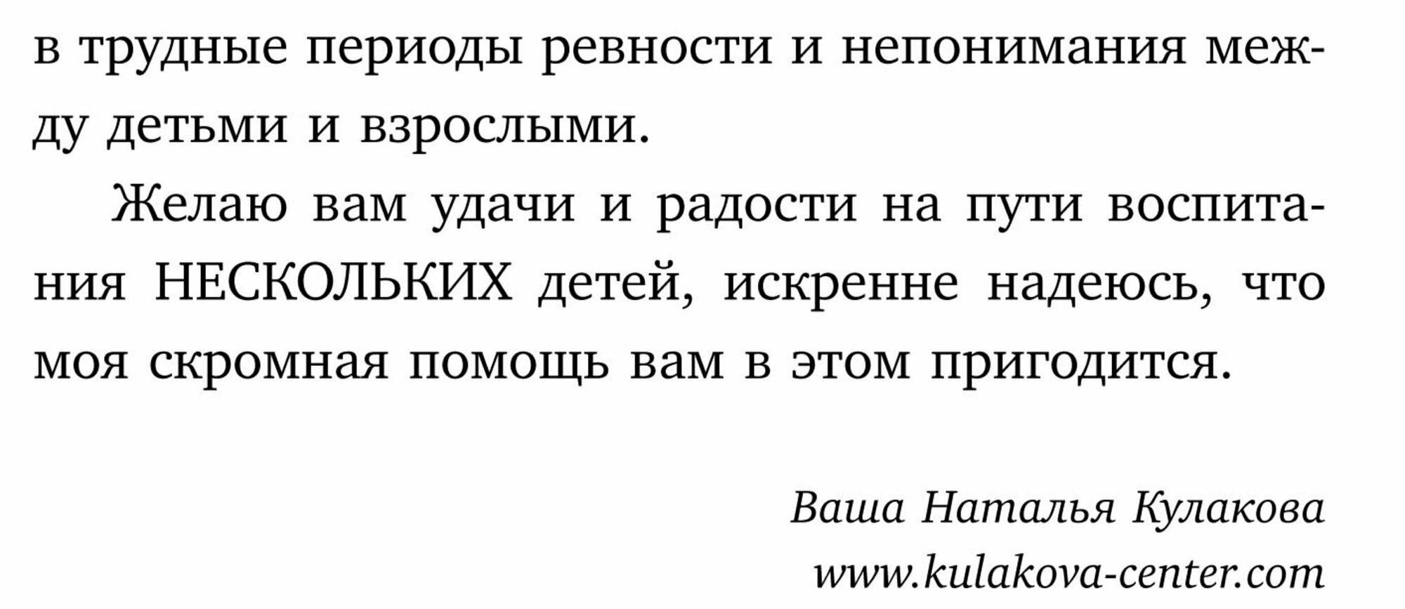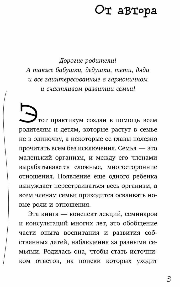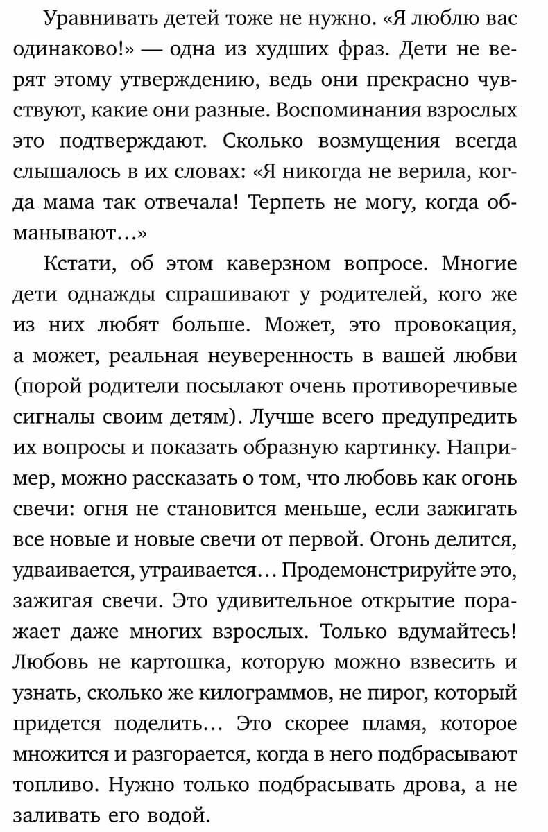 любую книгу оцениваю по принципу - сколько полезных мыслей для себя выделила. так вот в этой книге количество для меня зашкаливает! до этого читала книгу "Братья и сестры" Фабер, Мазлиш. совсем не пригодилась. а в этой очень много полезного: очень запомнился образ любви(в частности для ответа на вопрос детей - кого ты больше любишь) - любовь как огонь, от зажигания новой свечи огня меньше не становится или любовь как дом: появление нового малыша - это новая комната в доме.