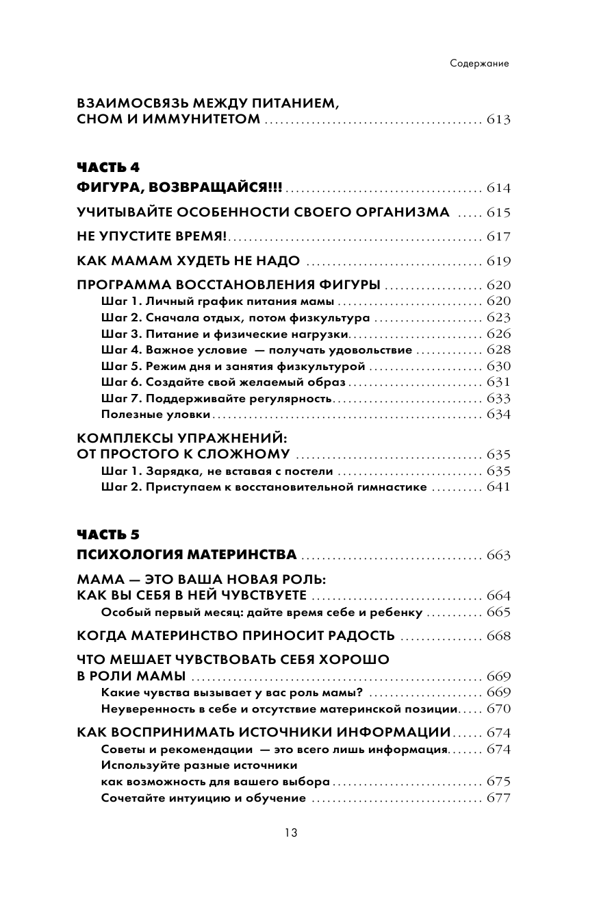 Счастливое материнствоЯ очень довольна, что купила эту книгу. Автор рассказывает, доступным языком как надо обрщаться с ребенком, картинки показывают как пеленать ребенка, умывать его. Я благодарна автору за такую книгу, ведь, мне – как будующей маме очень интересны и актуальны вопросы о том, как кормить ребенка, сколько он должен съедать за сутки, как правильно питаться маме во время грудного вскармливания, как ухаживать за пуповиной, сколько нужно спать самой маме, чтоб не быть раздражительной и ребенок получал от мамы только положительные эмоции, а не тревогу и раздражение. Ведь от состояние мамы, ее настроения и восприятия окружающей действительности зависит и то, как будет развиваться ребенок.Как надо ухаживать за собой после родов, ведь каждой девушке ставшей мамой, хочется выглядеть красивой и ухоженной. Также данная книга дает возможность понять как происходит развитие ребенка от 0 до 1 года и каждый месяц подробно раскрывается автором. В книге представлены актуальные вопросы по поводу здоровья маленьких ребят, как правильно укреплять здоровье малыша, какие прививки нужно делать малышу, а какие нет. Отдельно выделена глава про первого врача ребеночка – педиатора, как правильно построить общение и взаимоотношение с врачом. Также отдельными главами выделены вопросы о проблемах со здоровьем ребенка, иммунитет женщины после родов, восстановление менструального цикла, дослеродовая депрессия, каким должно быть питание и диета кормящей мамы, чтоб не было аллергических реакций у ее малыша. Программа восстановления фигуры позволяет маме прийти в норму и привести себя в порядок, представлены комплексы упражнений. Очень важным вопросом так же является психология материнства, страхи мамы, особенности психологического состояния после родов,как должна семья помогать маме в столь сложный период, как наладить сексуальные отношения с любимым человеком, 9 глава рассказывает о том, как маме ухаживать за собой в первый год материнства. Очень важным вопросом, я считаю, является вопрос о взаимоотношениях с окружающими родственниками, свекровью, друзьями. Эта книга ответила на многие мои вопросы о счастливом материнстве.