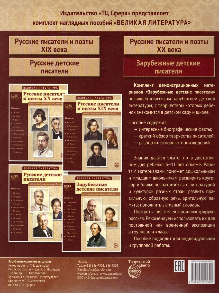 Замечательная серия! Все демонстрационные материалы от издательства "Сфера" отличаются исключительным качеством! Портреты выполнены на плотном картоне, упакованы в хорошую плотную папку (+ файл на липучке). Портреты красивые, яркие, все выполнены в одинаковом стиле. Это лучшие демонстрационные материалы, которые я встречала! На оборотной стороне карточек напечата информация о писателях. Покупала демонстрационные материалы от других издательств, но они не идут ни в какое сравнение с данными материалами, у других издательств они легко мнутся, выполнены на журнальных листах, а эти материалы прослужат очень долго! Приобрела всю серию! Спасибо издательству за просвещение, молодцы!