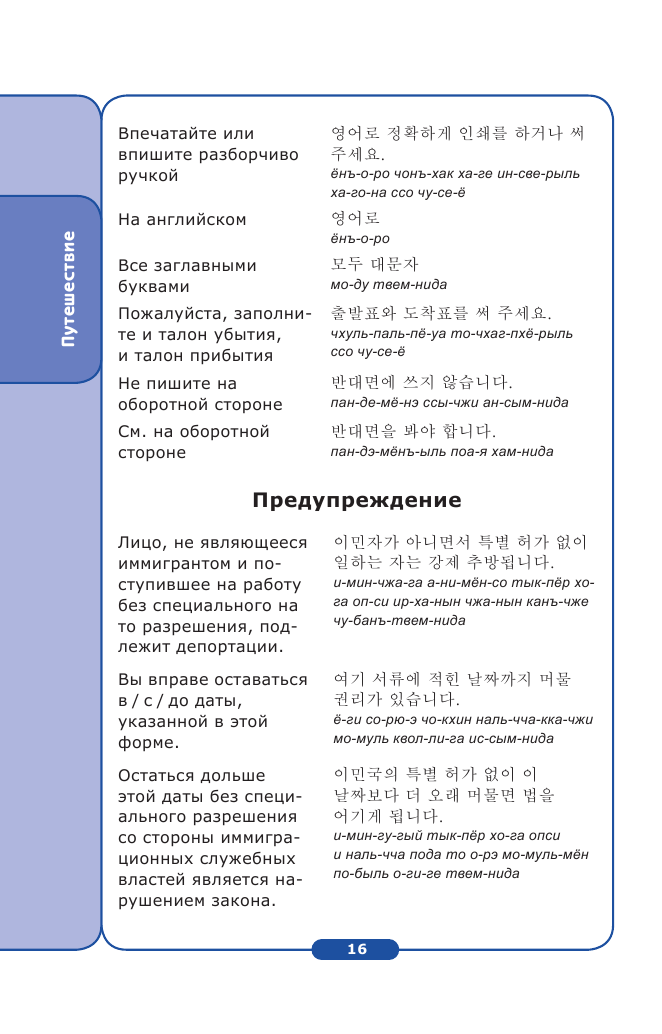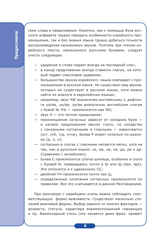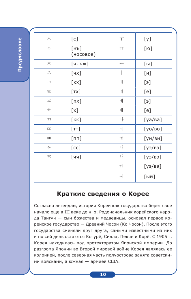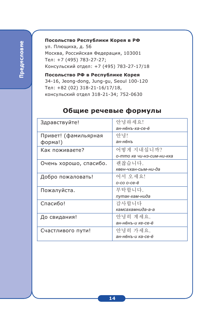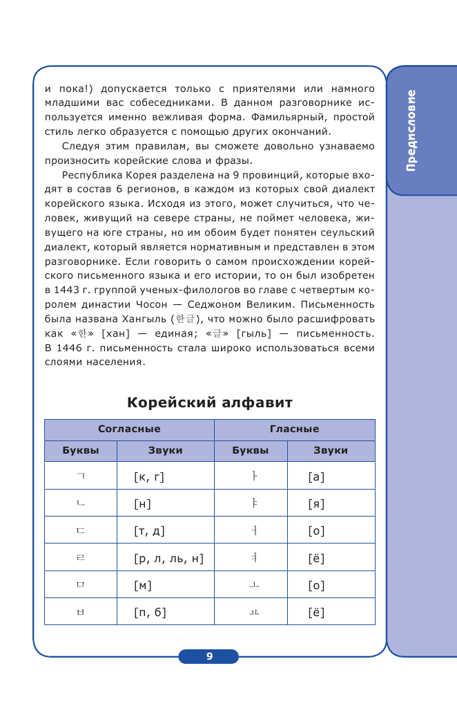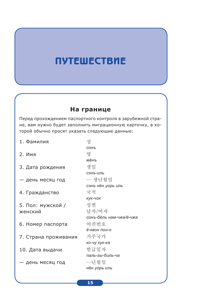 Маленький и компактный разговорник. В содержании вы увидите, что он поделён на отдельные темы вроде: приветствия, аэропорт, отель и так далее. Вместо одной будет несколько вариантов той или иной фразы в формальном и неформальном обращении (для корейцев это обязательно, вежливость в их стране очень ценна). С транскрипцией! Не просто фраза на корейском, а с нашей транскрипцией. Облегчили же нам задачу, даже не знающий языка человек разберётся. Так же после содержания идёт перевод хангыля на русский язык, что очень удобно. Иногда даже залезаю туда, дабы вспомнить значение букв, если память начинает подводить. А так красочный и простой в использовании разговорник с ладошку, который не займёт много места в вашей сумке.