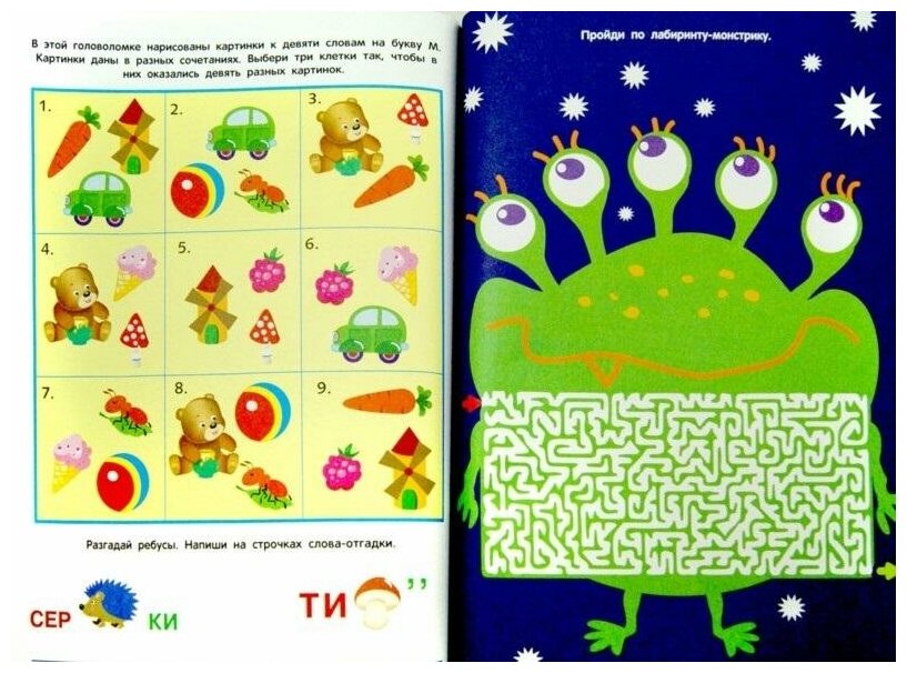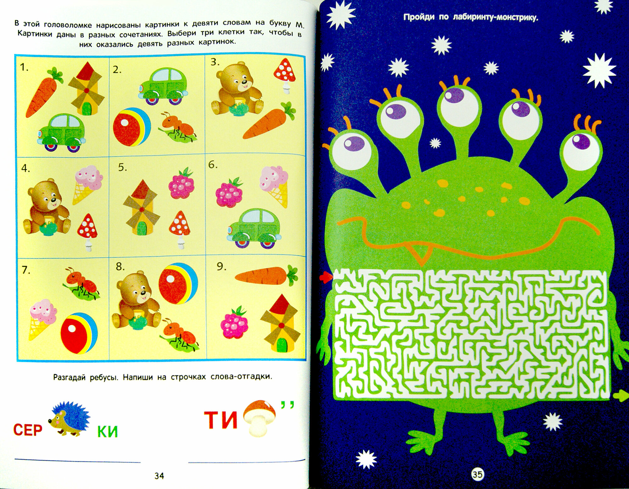 Очень хорошая книга. Странички плотные. Книга яркая,красочная,приятно по такой играть и заниматься. Очень много лабиринтов, далеко не все простые. Поэтому книга не для малышей. Есть задания на расшифровку послания. Есть просто кроссворды. Есть кроссворд, который надо восстановить из нескольких частей. Есть примеры с зашифрованными цифрами. Есть и ребусы.И задания со спичками,когда надо их перекладывать ,чтобы получить другую картинку.В общем есть над чем подумать и чем заняться с маленьким эрудитом. Очень понравилось.