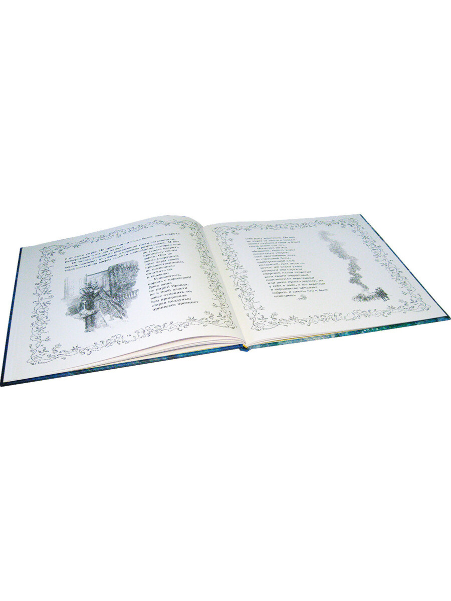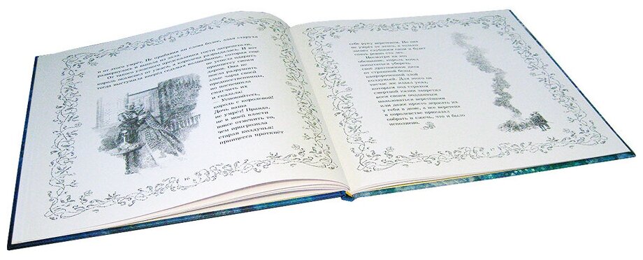 Эта книга кое-чем отличается от своих "сестричек" "Русалочки" и "Снежной королевы". Для начала размерами (она квадратная, обратите внимание на указанные размеры, длина равна ширине). Так что в высоту она меньше. В остальном: тоже без тиснения на обложке (да и ни к чему оно), красиво переливаются серебром буквы названия "Спящая красавица". Иллюстраций на форзацах нет. Зато есть довольно подробная статья об имевшихся вариантах сказки и их трансформации. Белая меловка довольно плотная, страницы по краям обрамлены узором. Номера страниц не всегда легко рассмотреть, "прячутся" они в этом узоре. Но думаю, что тут как раз ничего страшного нет, книга же не в 1000 страниц. Шрифт удобный для чтения, крупный.