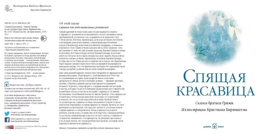 Новое издание "Спящей красавицы" с потрясающими иллюстрациями Кристиана Бирмингема - без преувеличения самая красивая иллюстрированная версия этой сказки: в книге 12 огромных цветных иллюстраций на целую полосу каждая и 22 черно-белых рисунка; специально для русского издания книги художник создал серию дополнительных оформительских элементов.