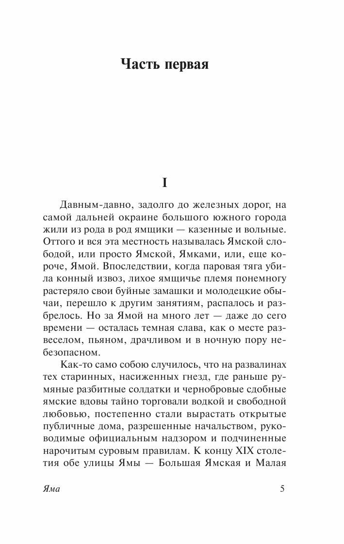 "Яма" - самое трагическое произведение Куприна, которое в свое время произвело среди читателей и критиков эффект разорвавшейся бомбы, и даже сейчас потрясает своей силой и беспощадным реализмом. Печальная история обитательниц борделя средней руки рассказана с почти фотографической точностью. Характеры "ночных бабочек", их клиентов и единственного друга - журналиста, образ которого у Куприна имеет автобиографические черты, восхищают психологической глубиной и яркостью. Роман захватывает не пикантностью темы, а честным, неравнодушным и человечным отношением автора к судьбе девушек, которых обстоятельства завели в "Яму".