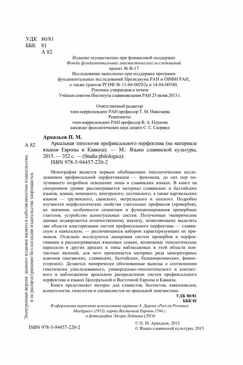 Ареальная типология префиксального перфектива (на материале языков Европы и Кавказа) (П. М. Аркадьев); Языки Славянской Культуры, 2015