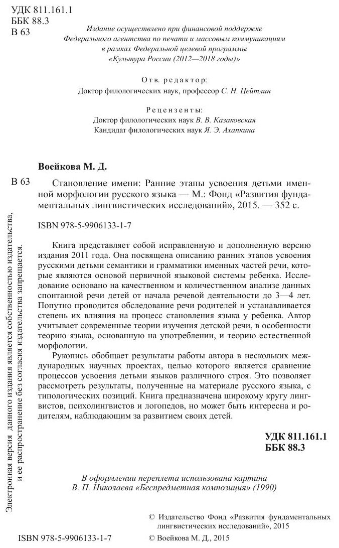 Становление имени: Ранние этапы усвоения детьми именной морфологии русского языка (Воейкова Мария Владимировна); Фонд Развития фундаментальных лингвистических исследований, 2015