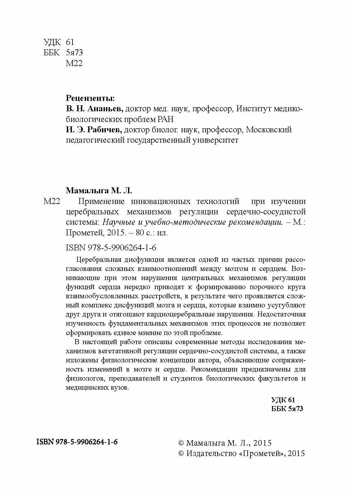 Применение инновационных технологий при изучении церебральных механизмов регуляции сердечно-сосудис (М. Л. Мамалыга); Прометей, 2015