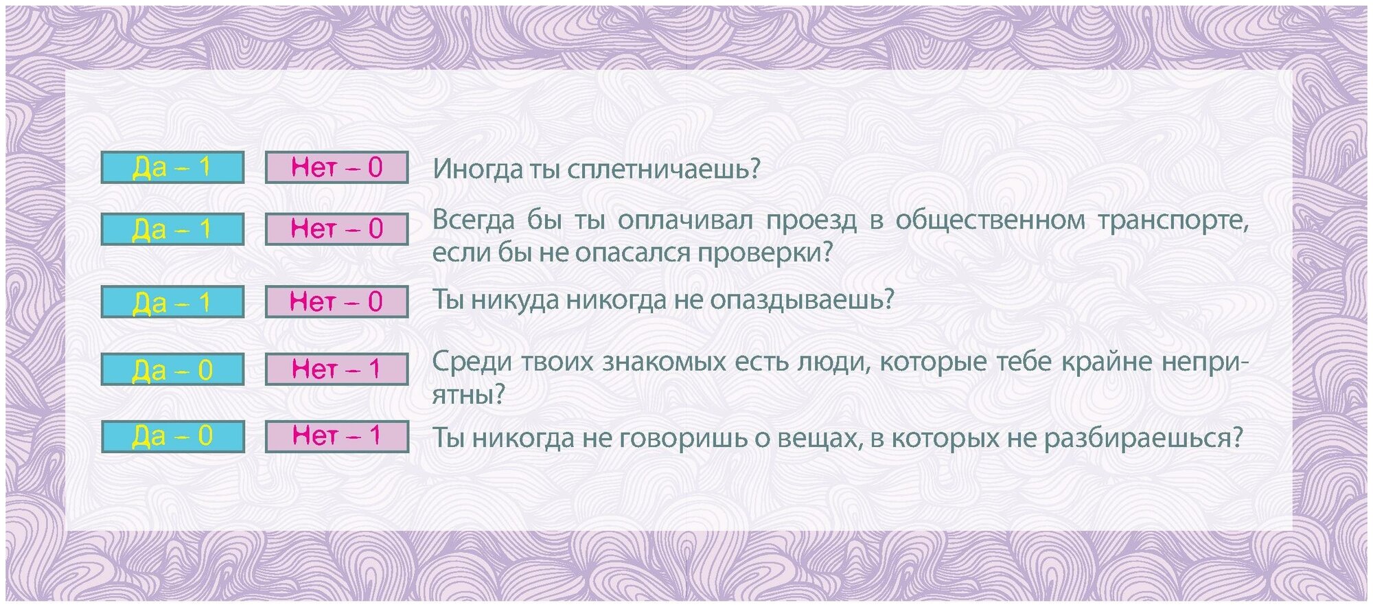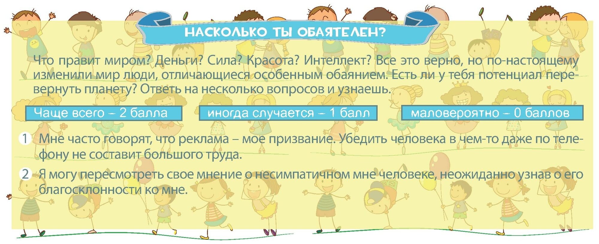 Ты когда-нибудь задумывался, кто ты на корабле жизни: мудрый капитан, предусмотрительный штурман или капризный пассажир? Смог бы выжить в кругосветном путешествии? А какое у тебя потенциальное психическое расстройство? Нет? Тогда путешествие - самое подходящее время, чтобы это исправить! Мы собрали для тебя самые интересные, веселые и оригинальные психологические тесты. Захвати их с собой в дорогу! Они обязательно поднимут тебе настроение, а заодно заставят задуматься.