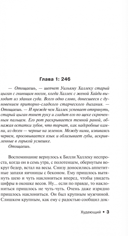"Худеющий" - это замысловатый сюжет о мести, который раскручивается непредсказуемо, заставляя строить догадки, кто же из двух мужчин - Билли Халлек или Тадуз Лемке - выйдет победителем из схватки, где за ценой стоит не только жизнь адвоката, но и его семьи, друзей, родственников "цыганского барона", да и всего табора.
