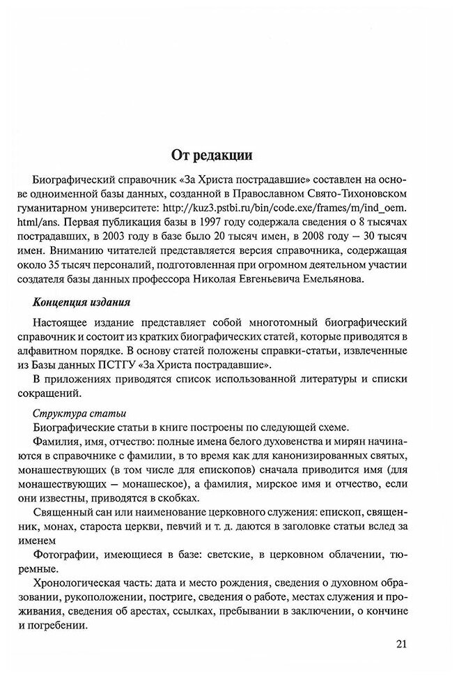 Биографический справочник "За Христа пострадавшие" содержит сведения о пострадавших за православную веру в годы репрессий клириках и мирянах Русской Православной Церкви. Справочник составлен по материалам одноименной базы данных, разработанной д.т.н. проф. Н.Е. Емельяновым в Православном Свято-Тихоновском гуманитарном университете на базе оригинального программного обеспечения СУБД НИКА (разработка Института системного анализа РАН). Сведения о пострадавших приводятся в алфавитном порядке. Первый том составлен из биографических справок на букву А (около 2 000 персоналий).