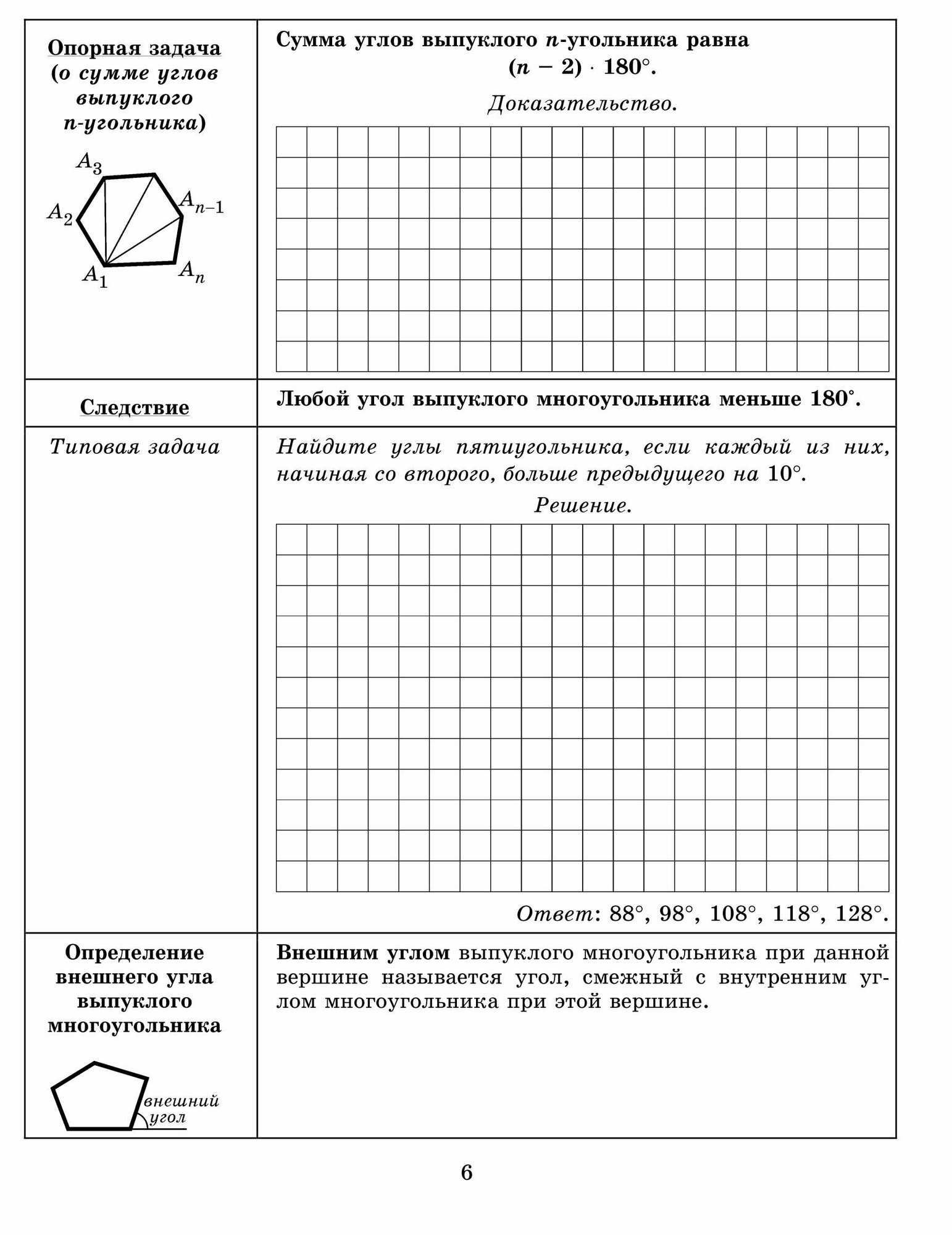 Тетрадь-конспект содержит все основные теоретические сведения - определения, аксиомы, теоремы и следствия из них - курса геометрии 8 класса (по учебнику Л.С. Атанасяна и др.). Опорные задачи содержат важные свойства геометрических фигур, не выраженные в теоремах. Типовые задачи описывают простейшие и более сложные геометрические ситуации, наиболее часто встречающиеся в тематических проверочных работах. Полезные задачи описывают дополнительные свойства изучаемых геометрических фигур. Ко всему материалу приведены чертежи, после теорем и задач оставлено место для самостоятельного заполнения учащимися. К отдельным теоремам и задачам приведены доказательства, решения или указания к решению.